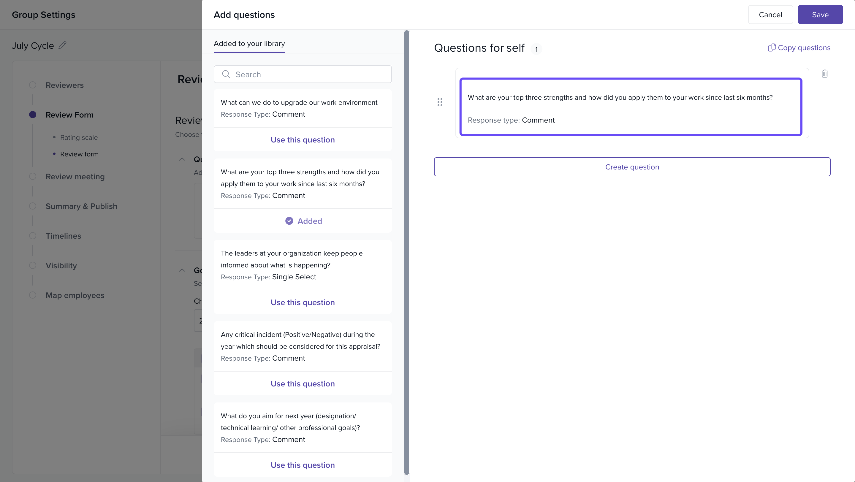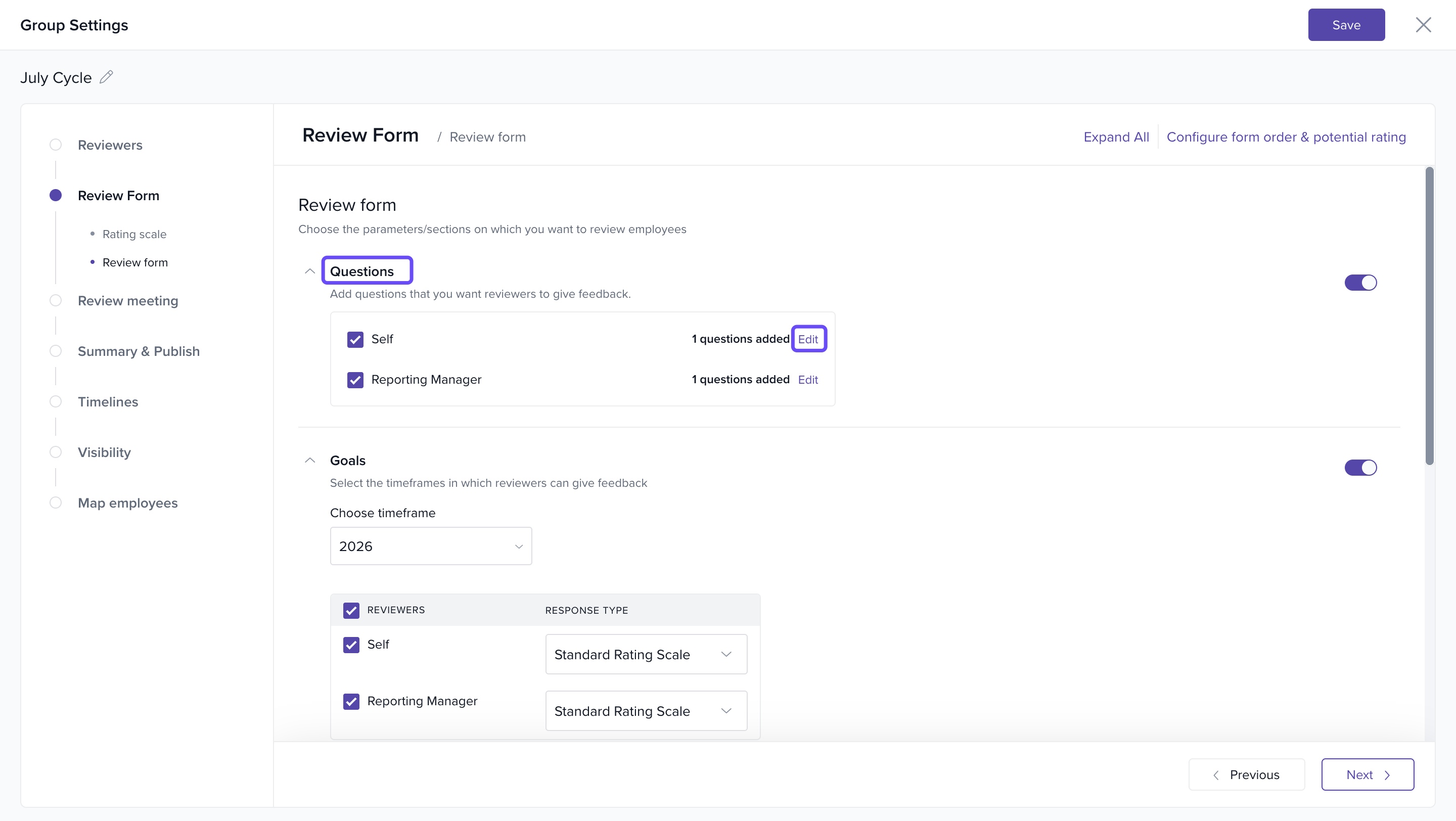 Click on the Questions tab under the respective reviewer (e.g., Self, Manager).