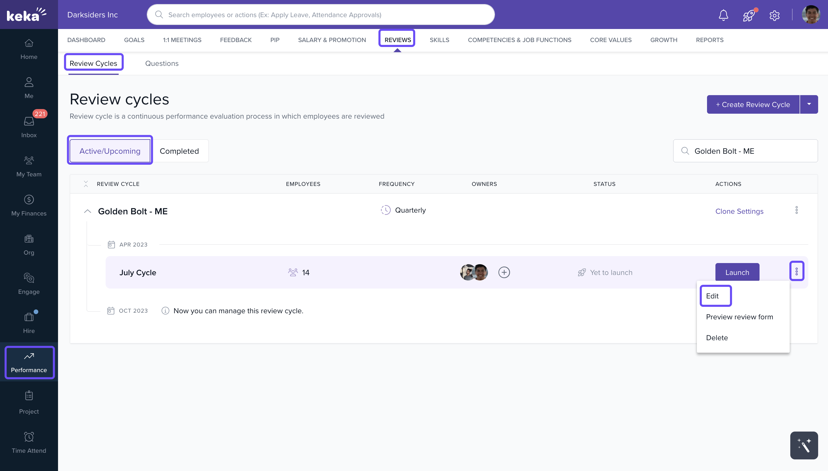 Under Review Cycles, select the cycle you want to modify.