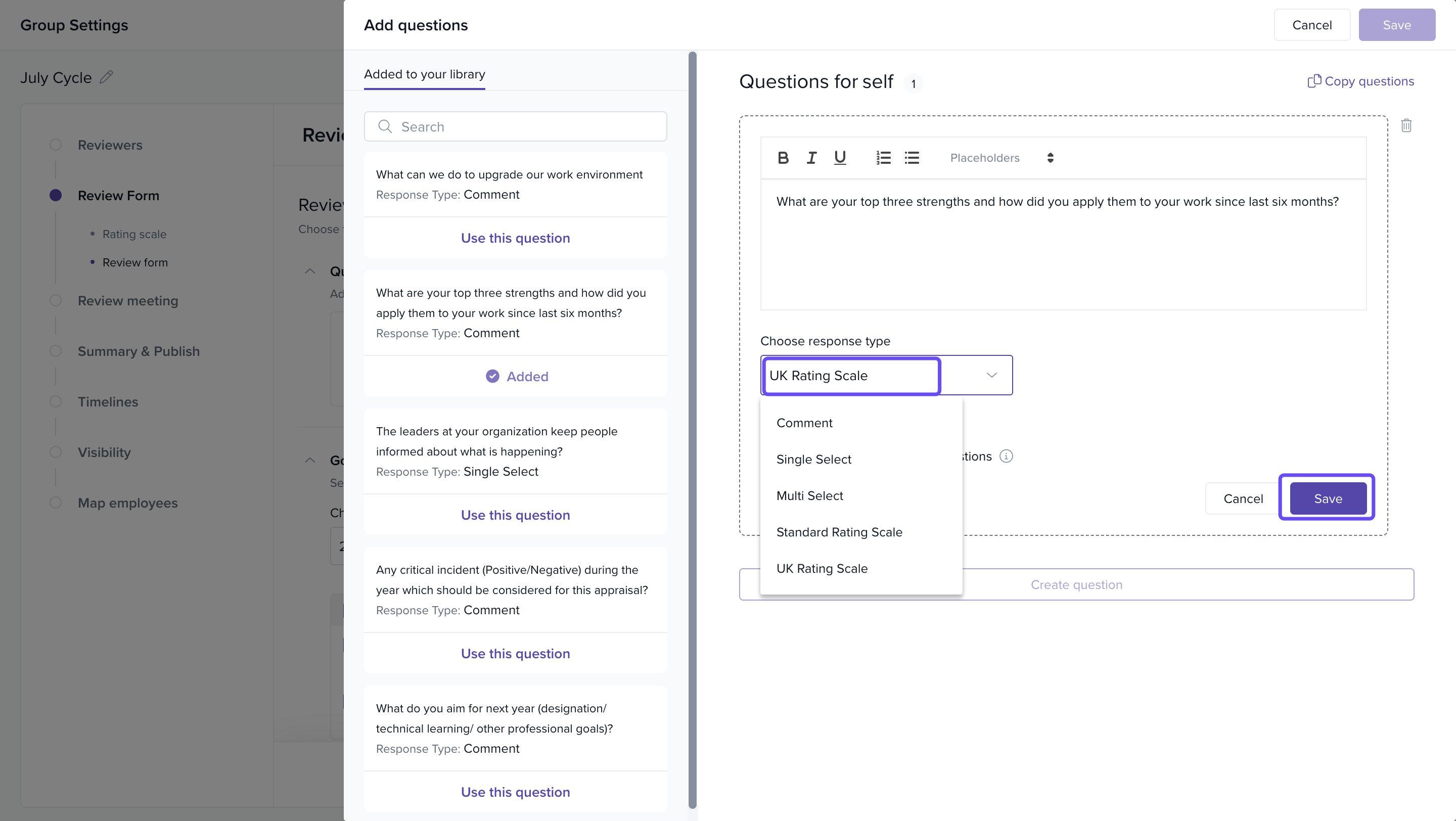 Under the Response Type dropdown, select your desired input type (e.g., Rating Scale, Single Select, etc.).