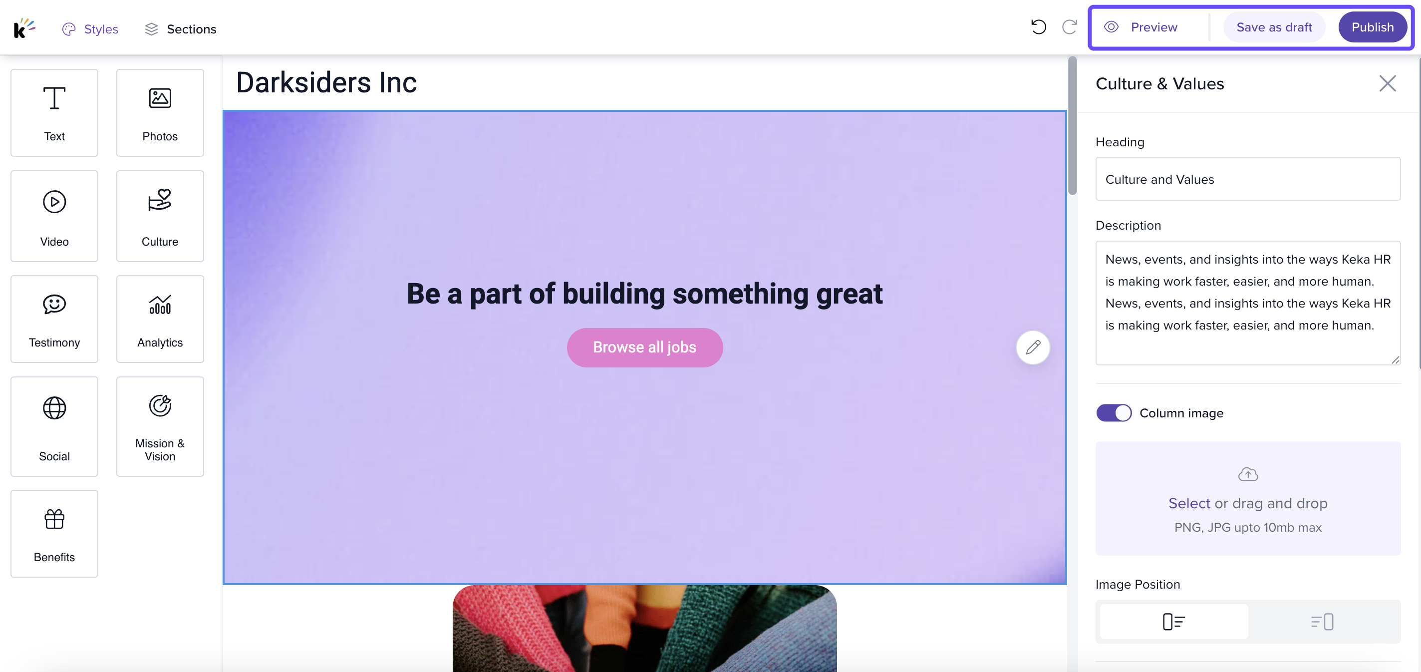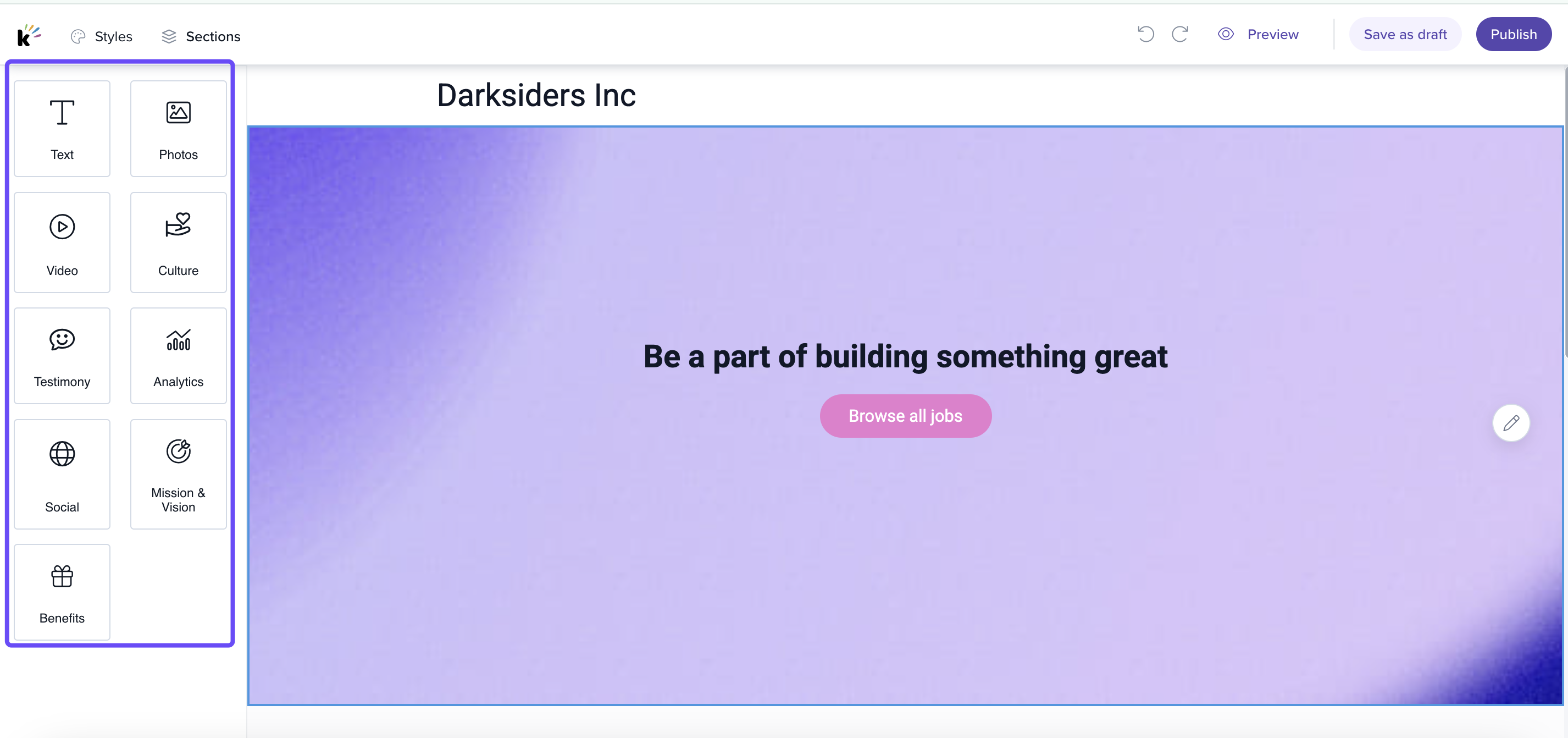 Tip: Use the drag-and-drop builder to easily match your site to your employer brand.