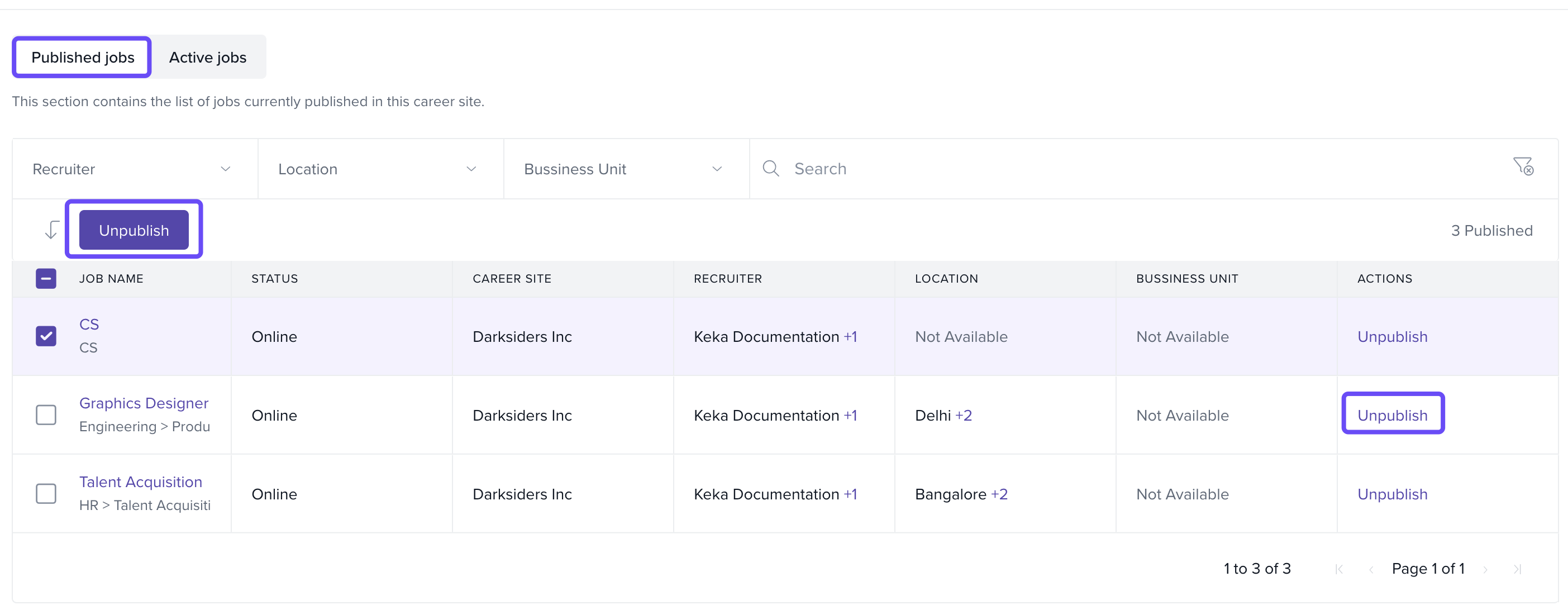 For multiple jobs: Select checkboxes → click Unpublish at the top.