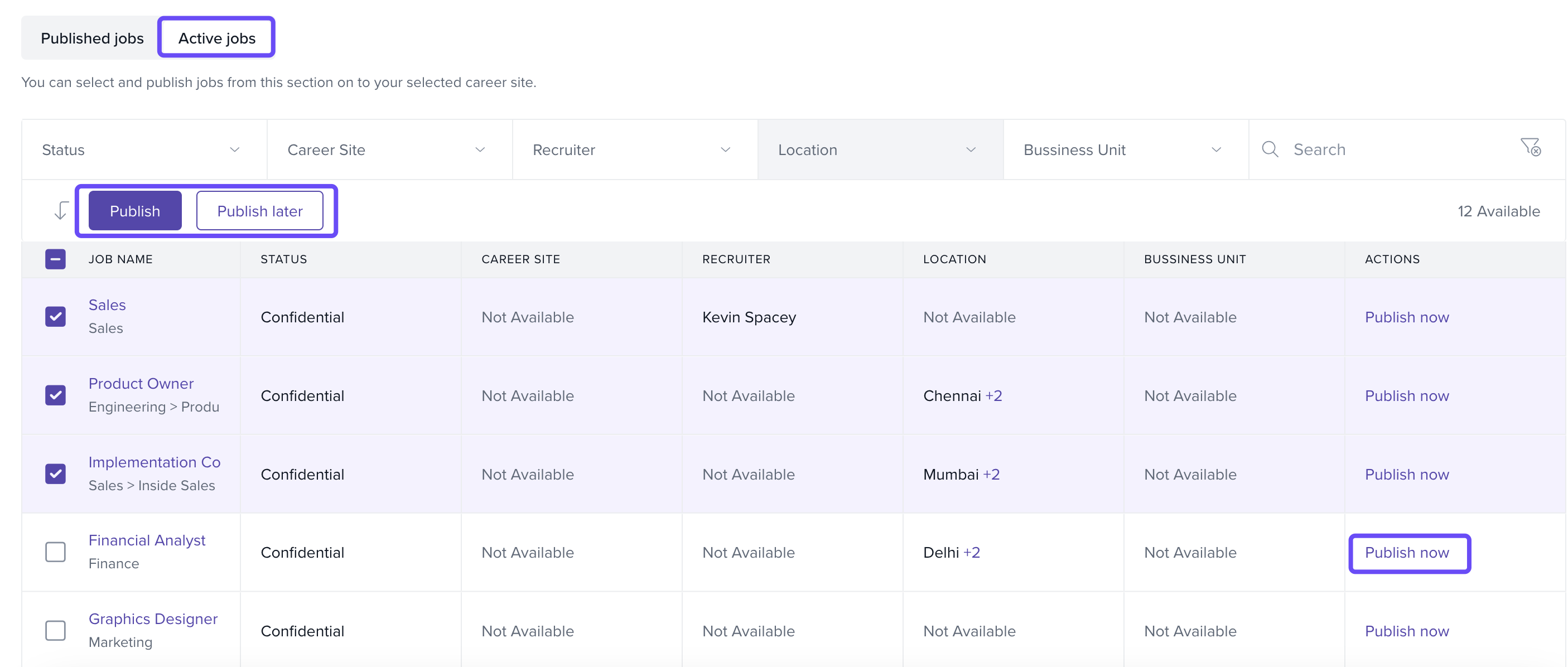 For multiple jobs: Select checkboxes → click Publish at the top.