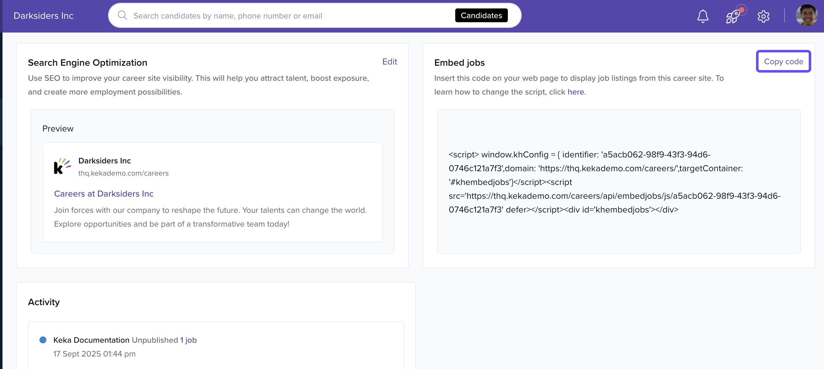 The Embed Jobs section lets you add job listings from your career site to your company's main website or other pages.