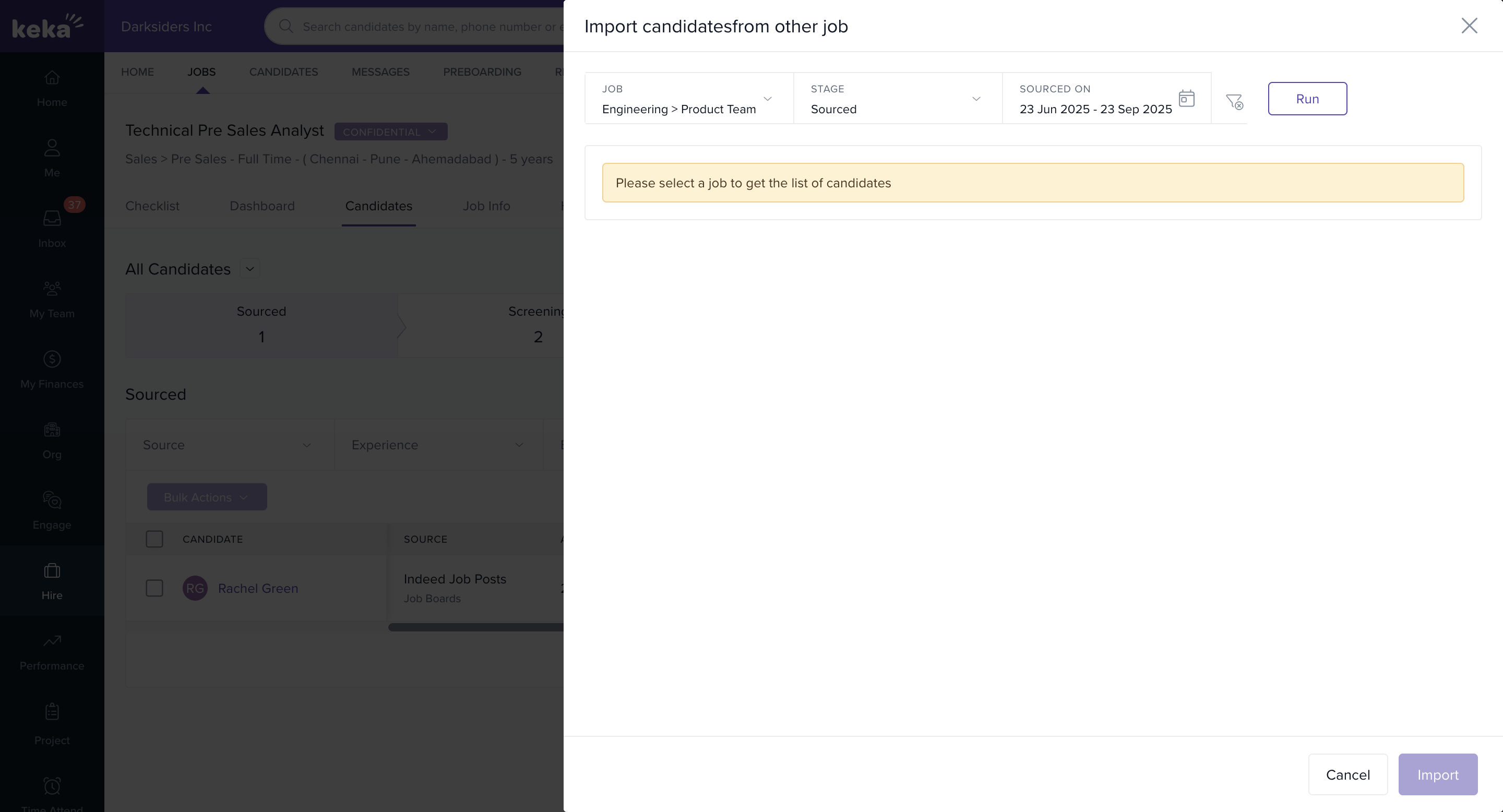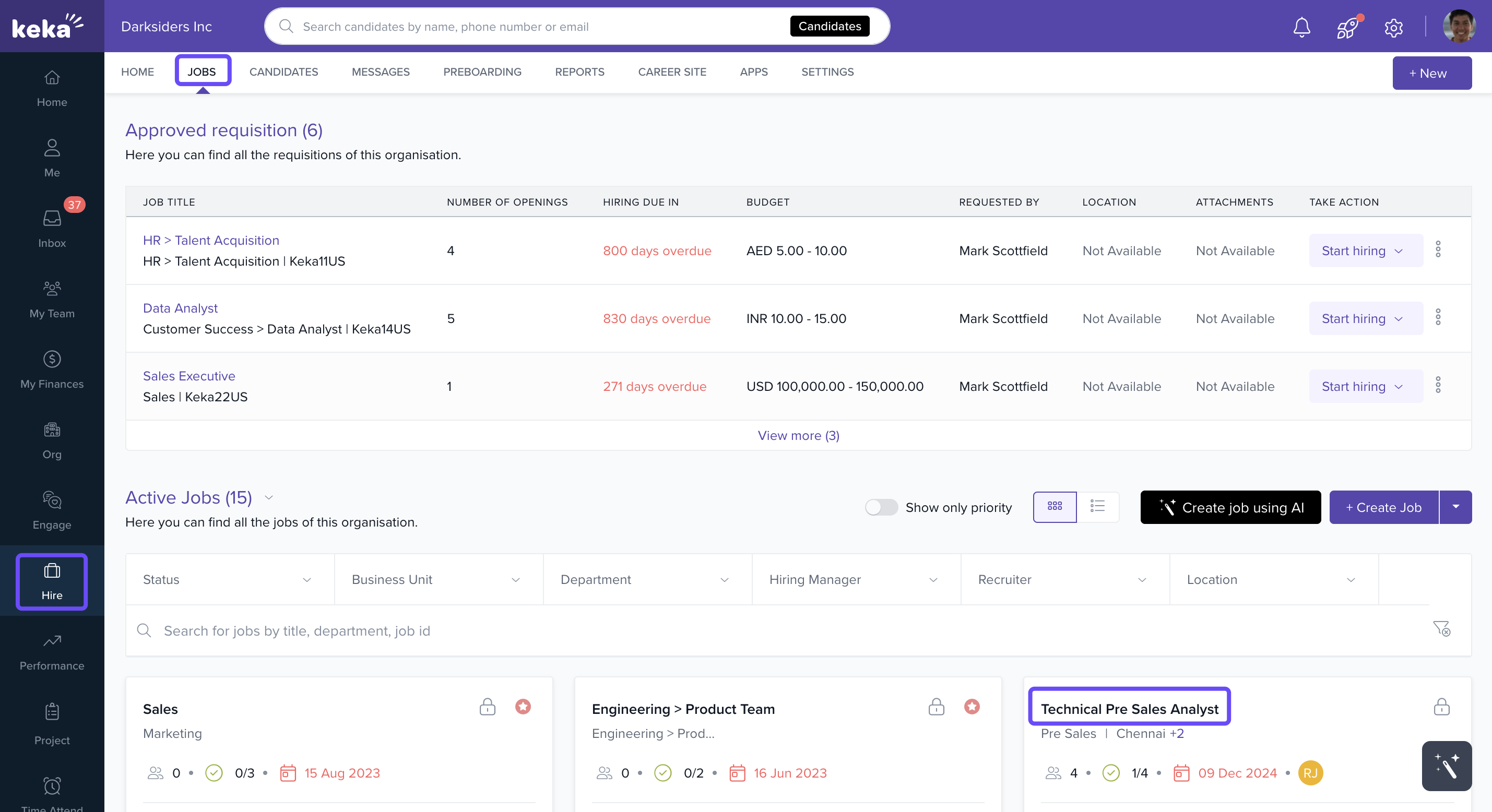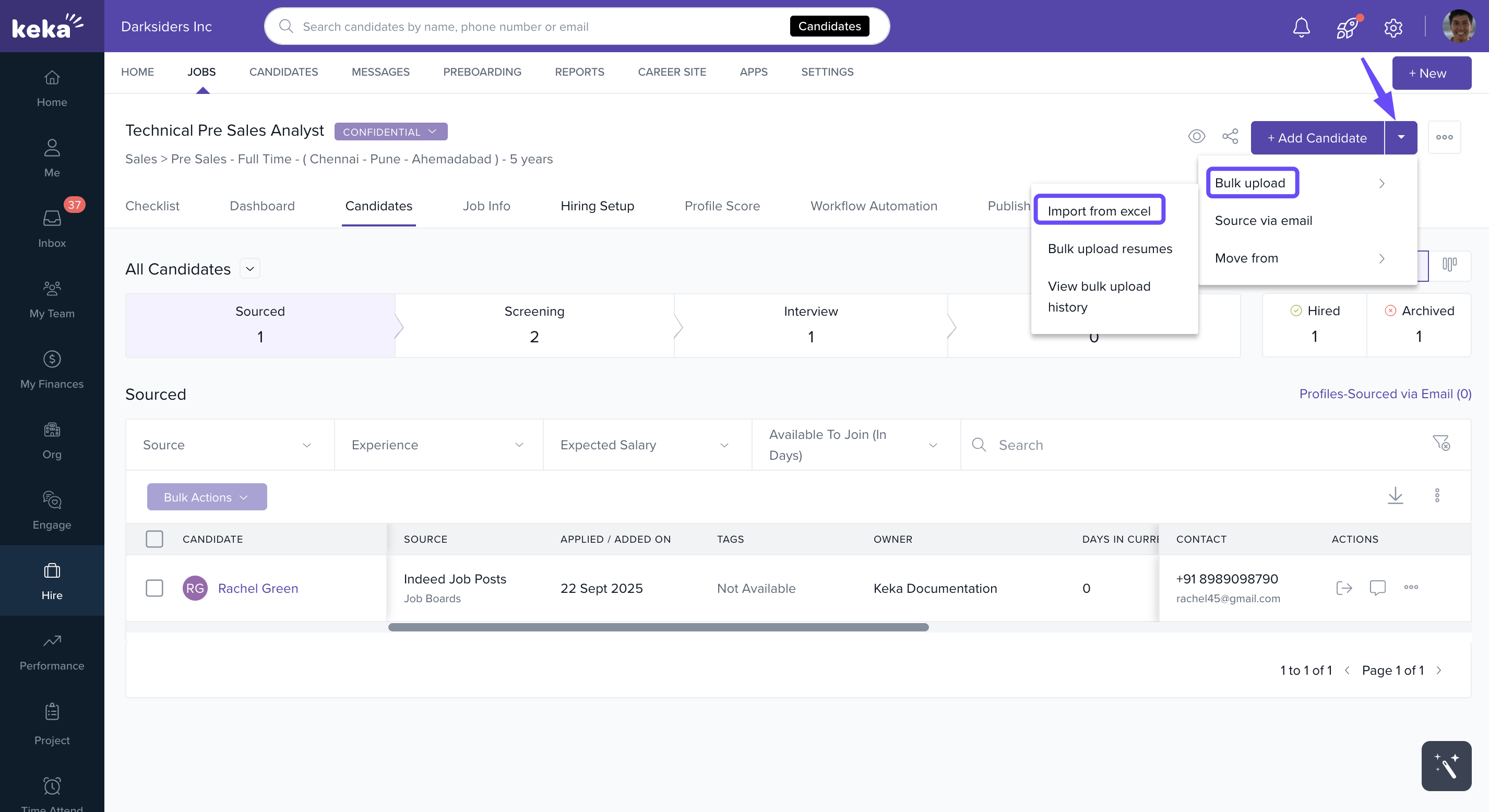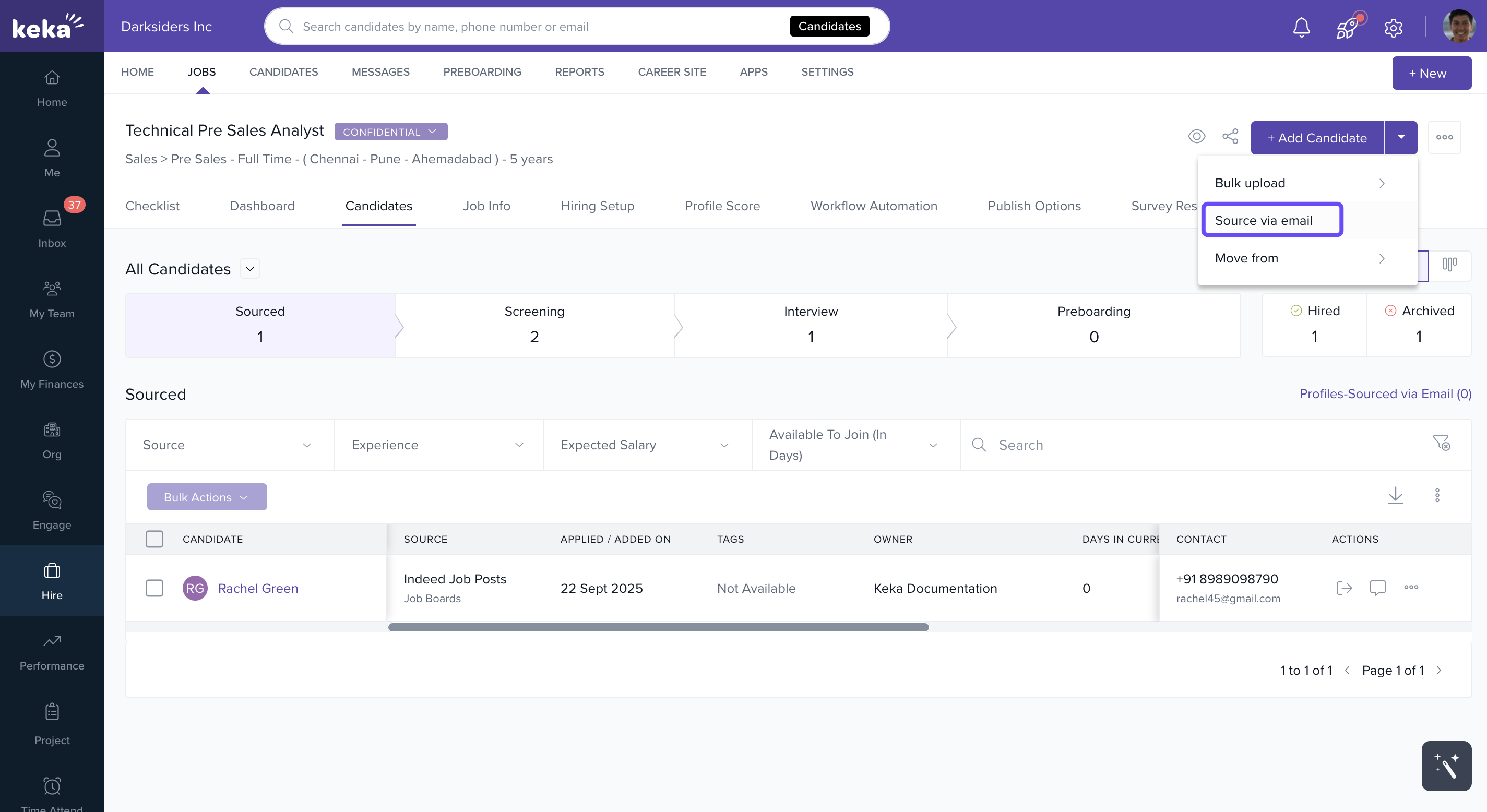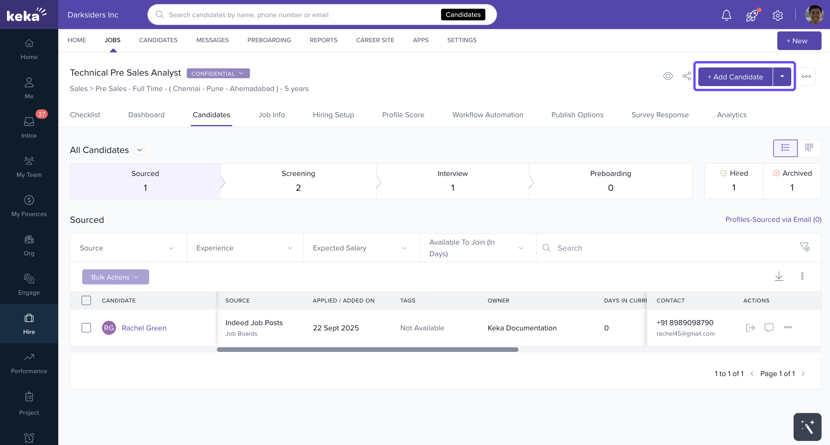 Once a job is created in Keka Hire, the next step is to add candidates. Linking candidates to jobs keeps your recruitment process organized and efficient.