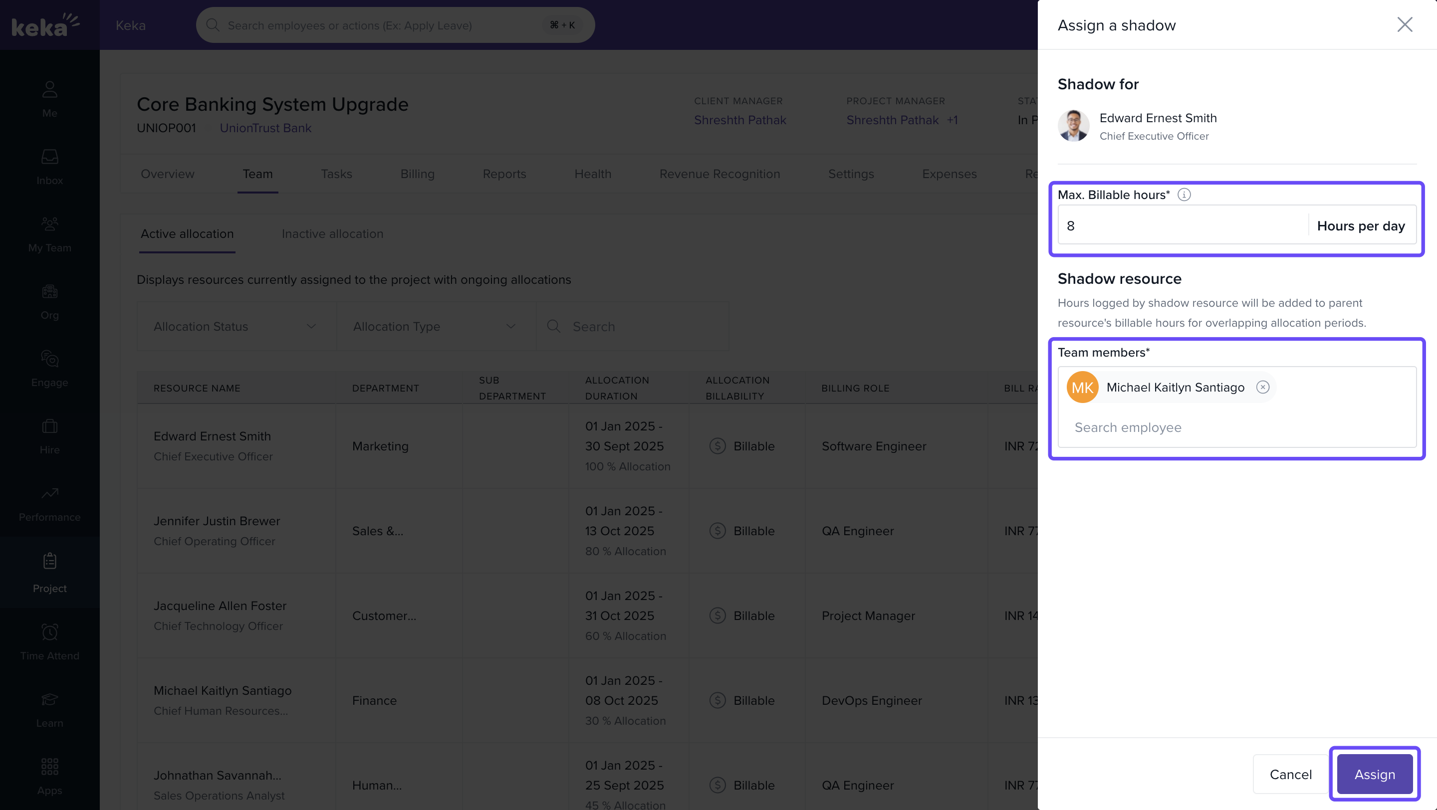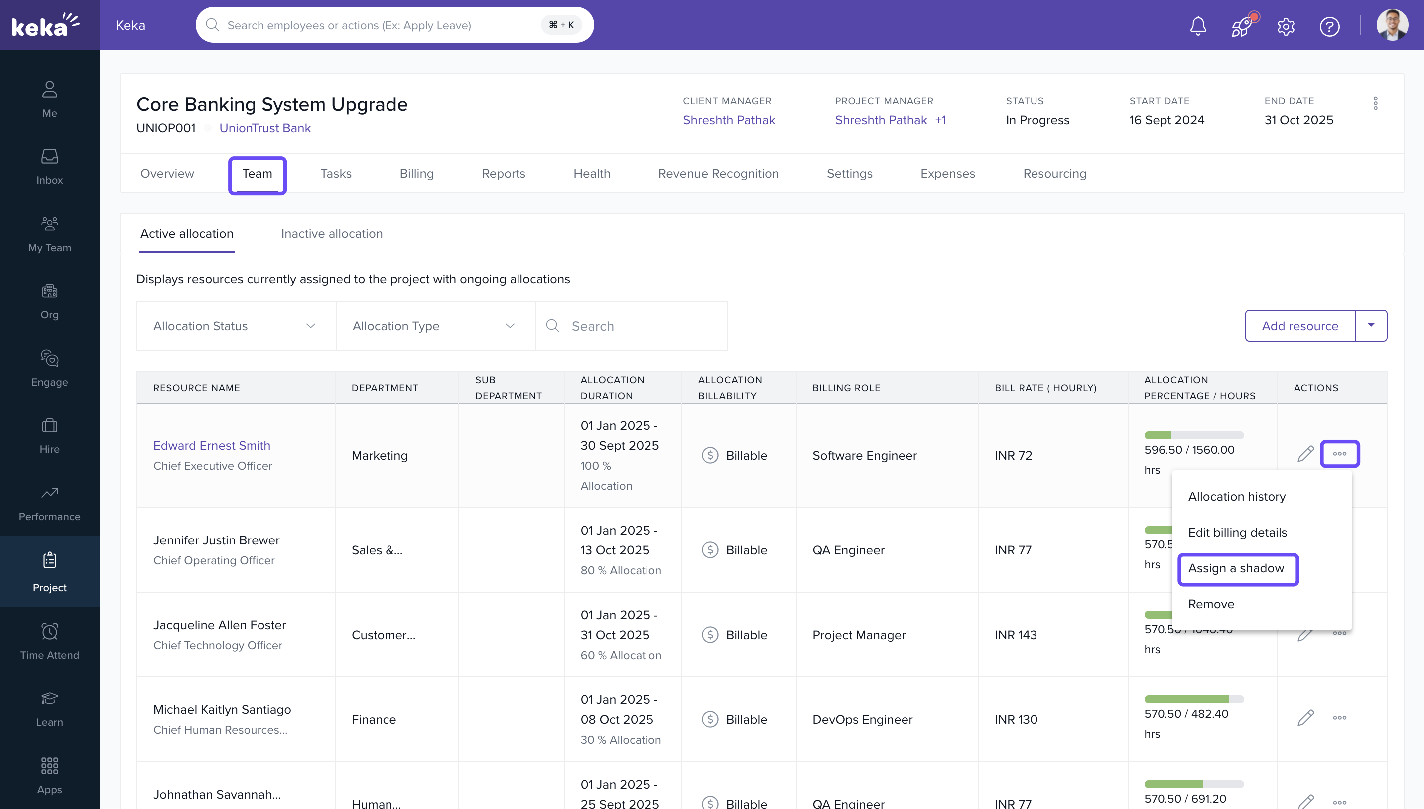 Keka PSA's Shadow Resource feature lets project managers assign a junior resource to assist a senior team member. This ensures better task distribution and allows senior resources to focus on critical work, enhancing productivity and project outcomes.