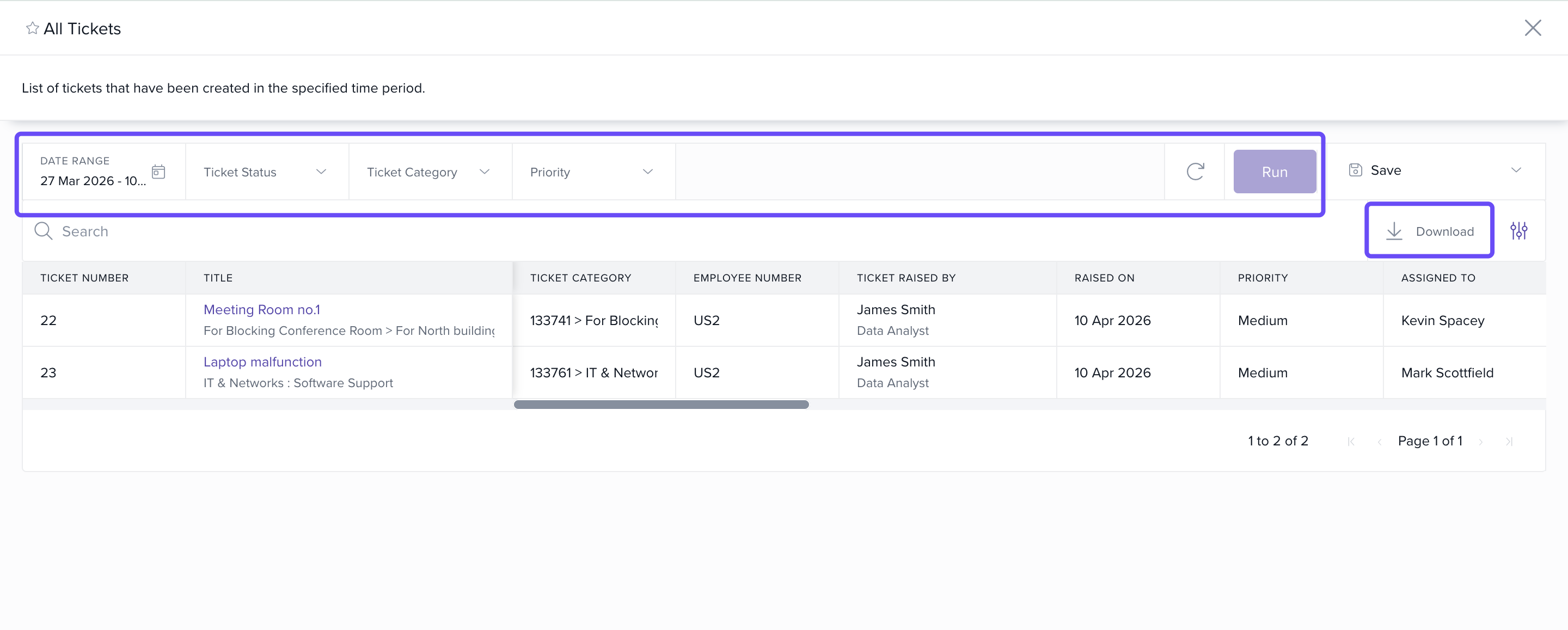 Lists every ticket—both active and closed—within a selected date range.Closed Tickets