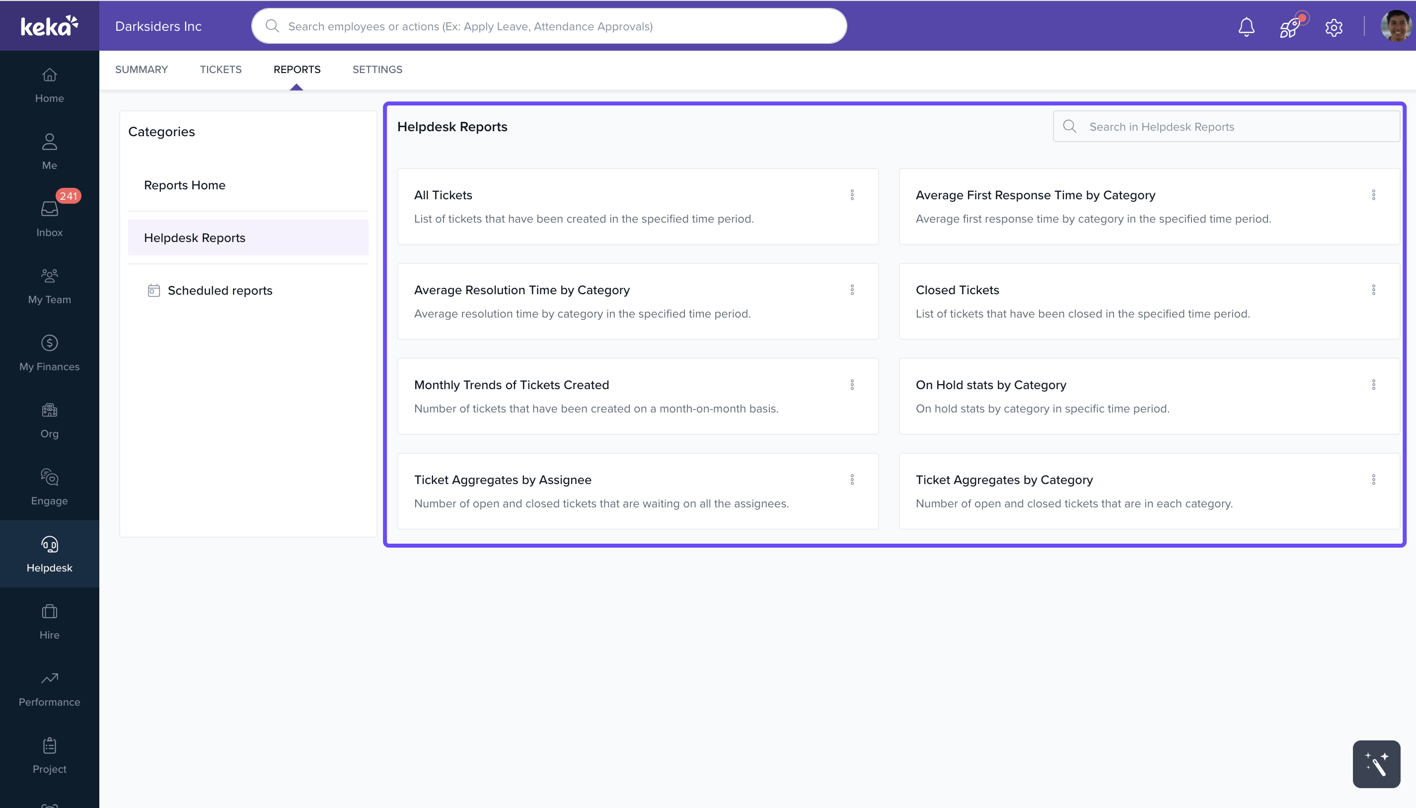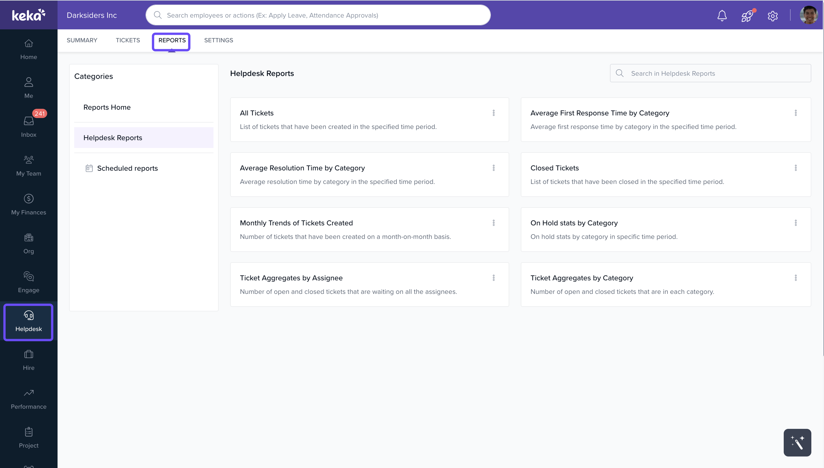 This article helps Keka administrators navigate and utilize the Helpdesk Reports feature. You'll learn how to reach the reports section, understand the variety of report types available, and download them efficiently. These insights are essential for tracking ticket volume, response times, and overall helpdesk performance.