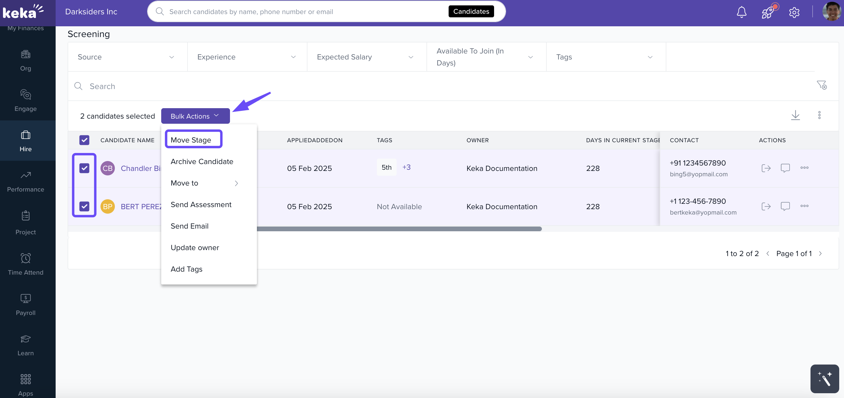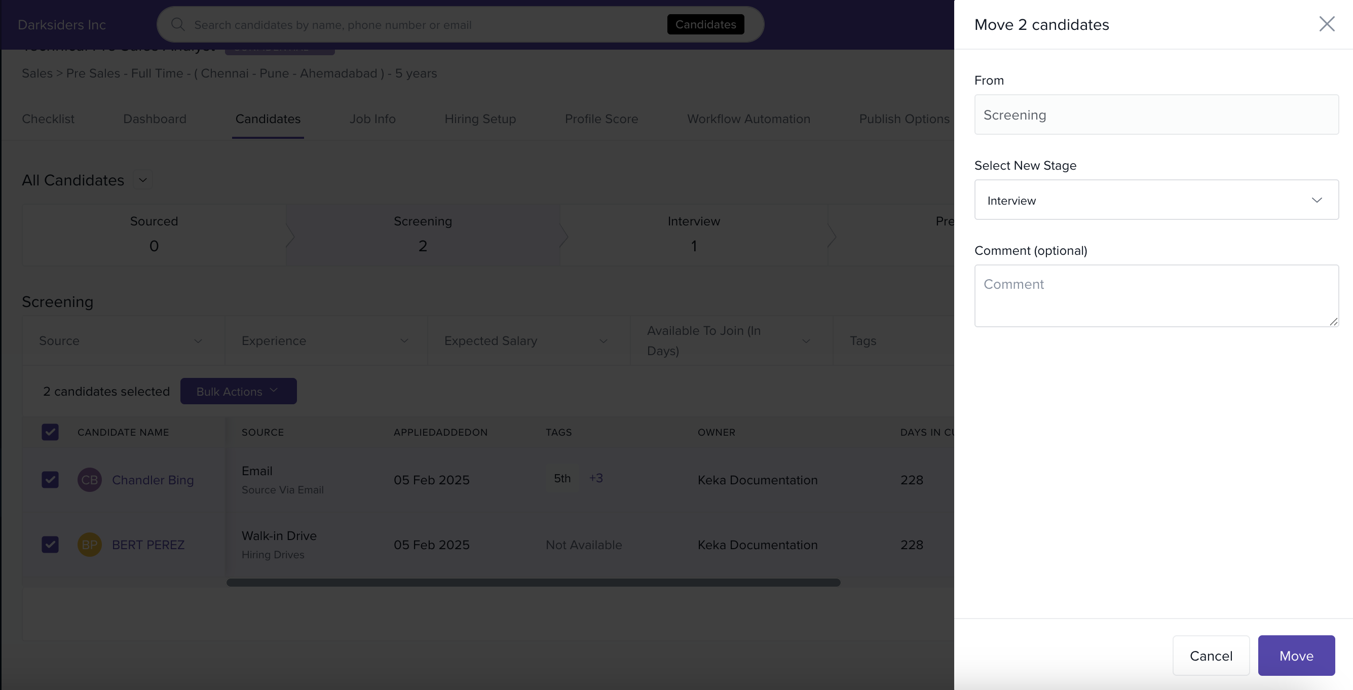 Tip: You can manage multiple candidates in bulk to save time—especially useful for progressing groups through initial stages like Screening or Assessment.