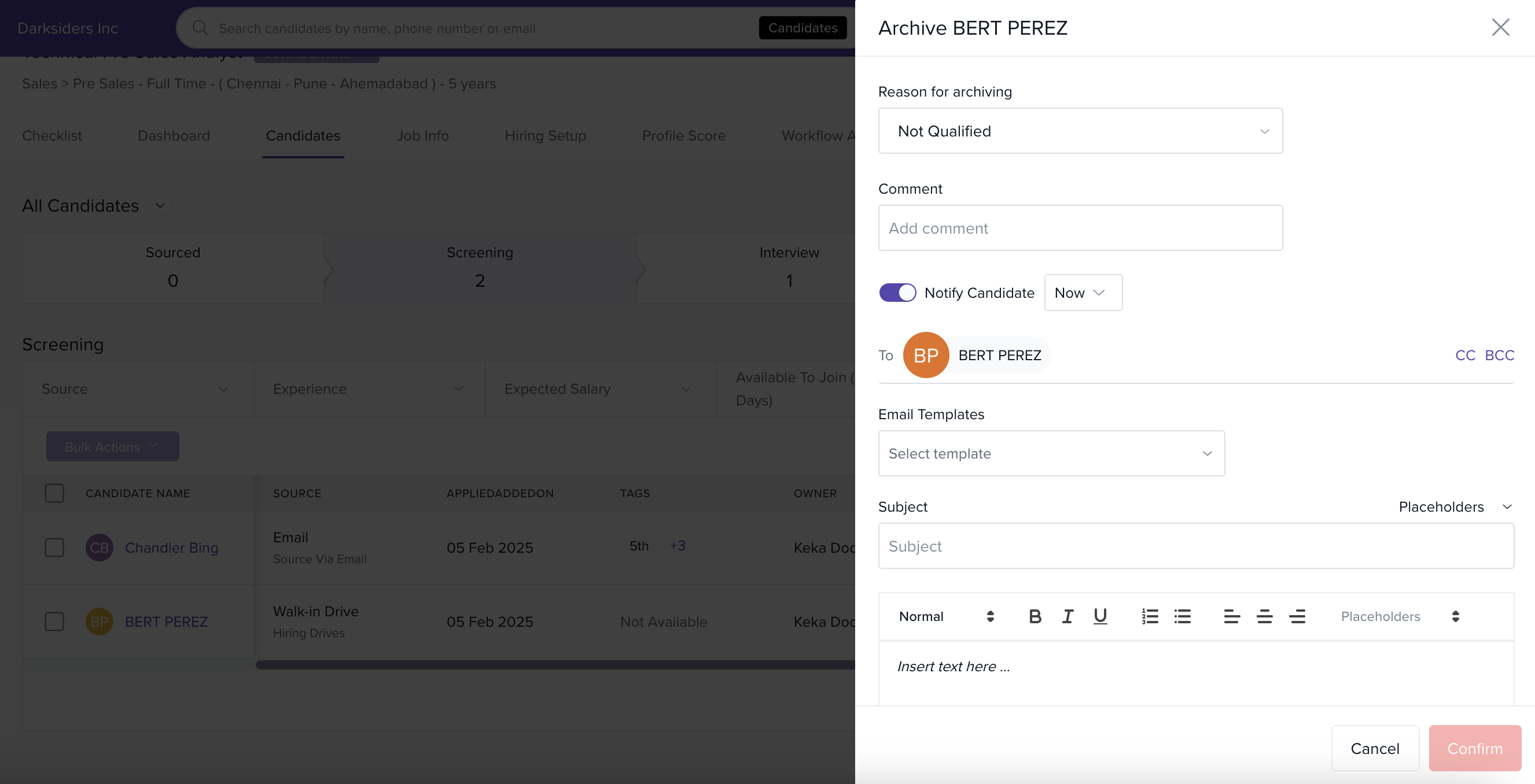 Note: All actions such as archiving and assessments can be customized with templates and notifications to maintain a consistent candidate experience.