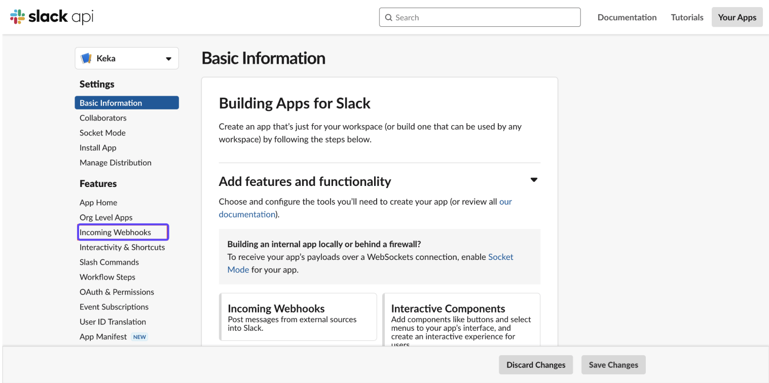 In your Slack app configuration page, go to the left navigation bar and select Incoming Webhooks.