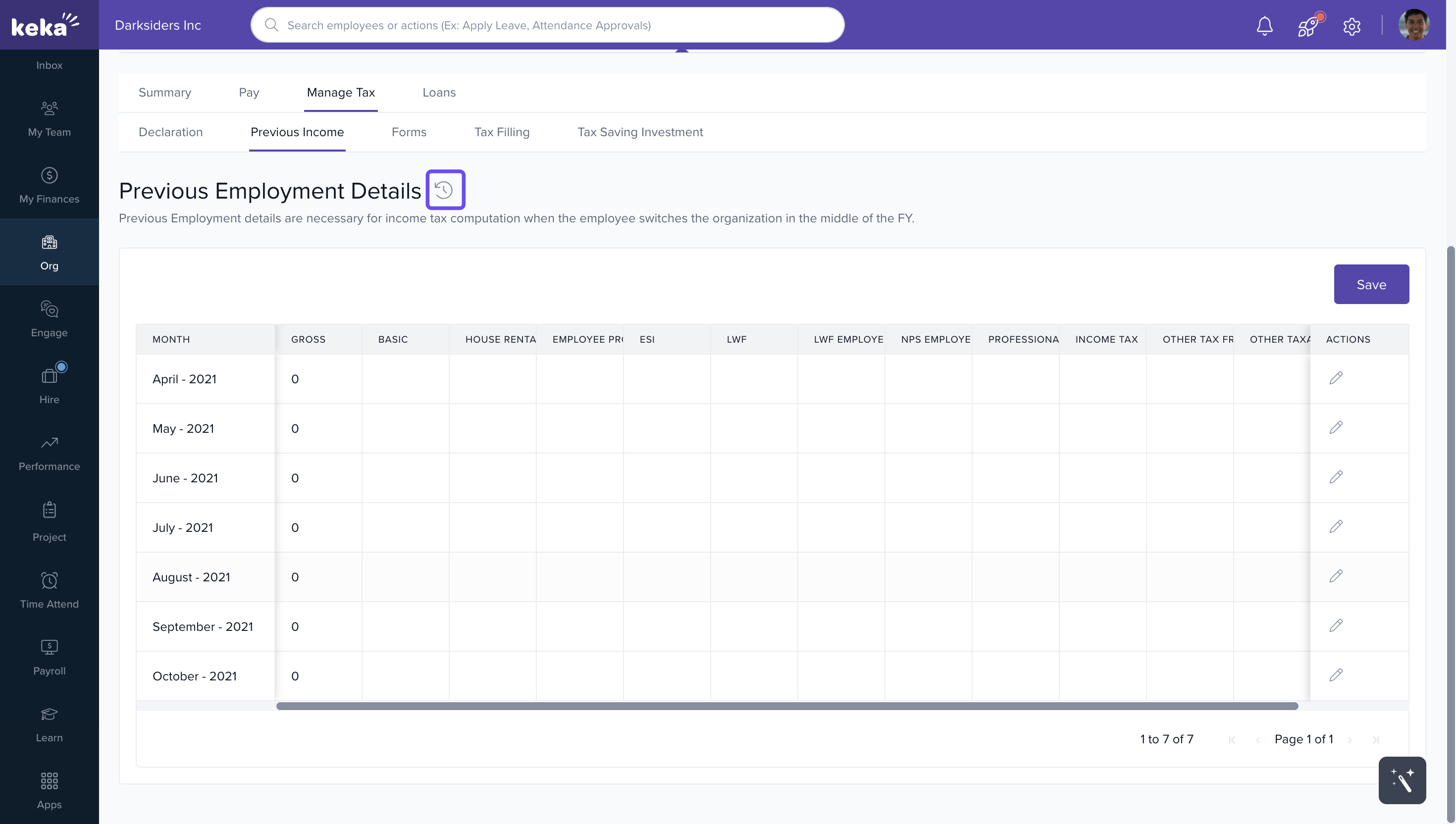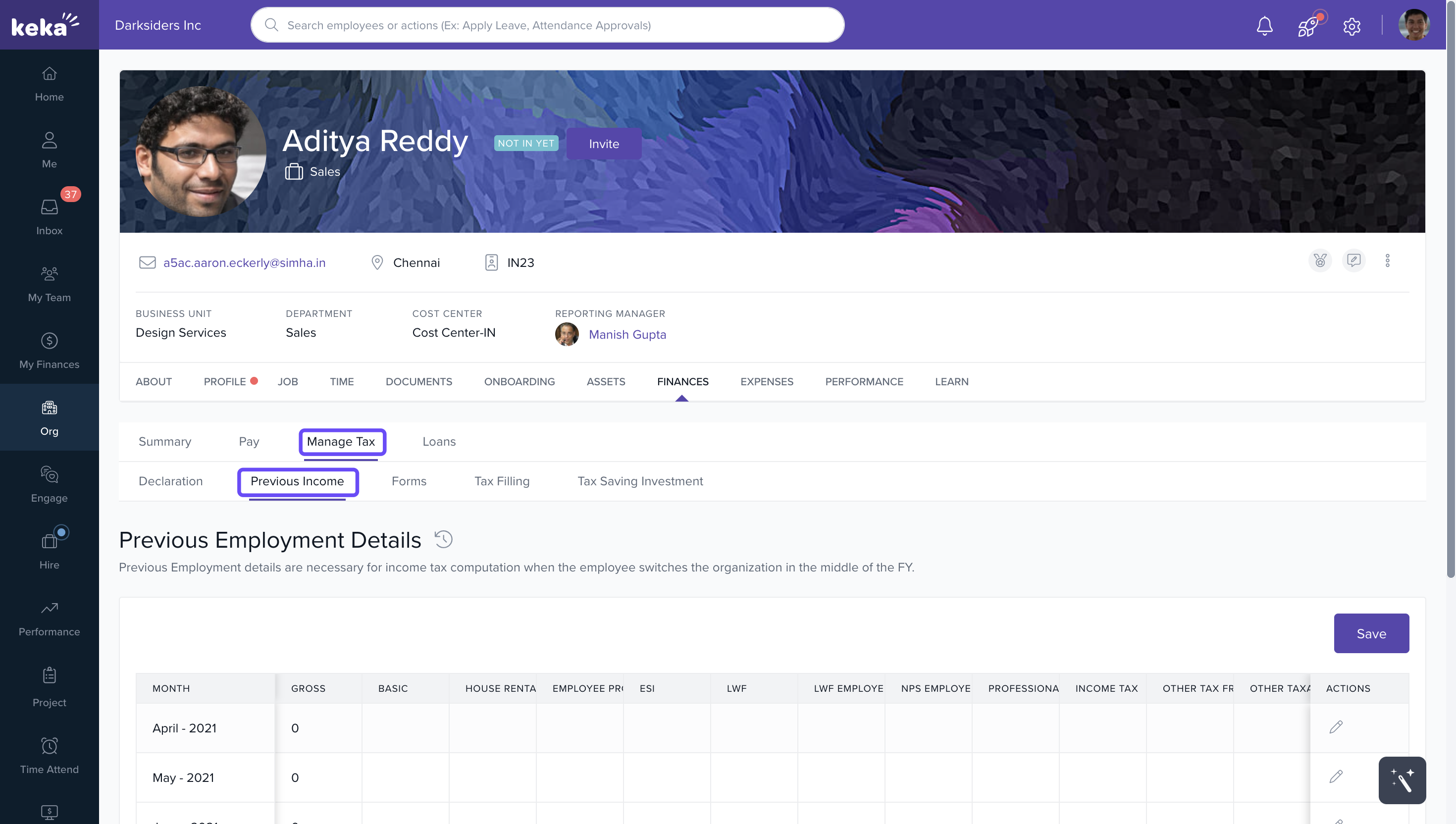 3. Go to Manage Tax → Previous Income tab.