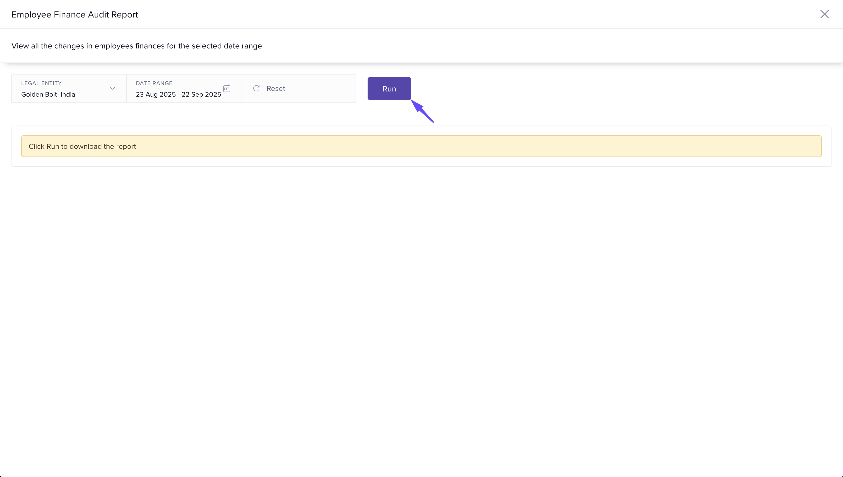 Downloadable reports: Generate an Excel report for your legal entity showing all employee finance changes, useful for statutory or internal audits.
