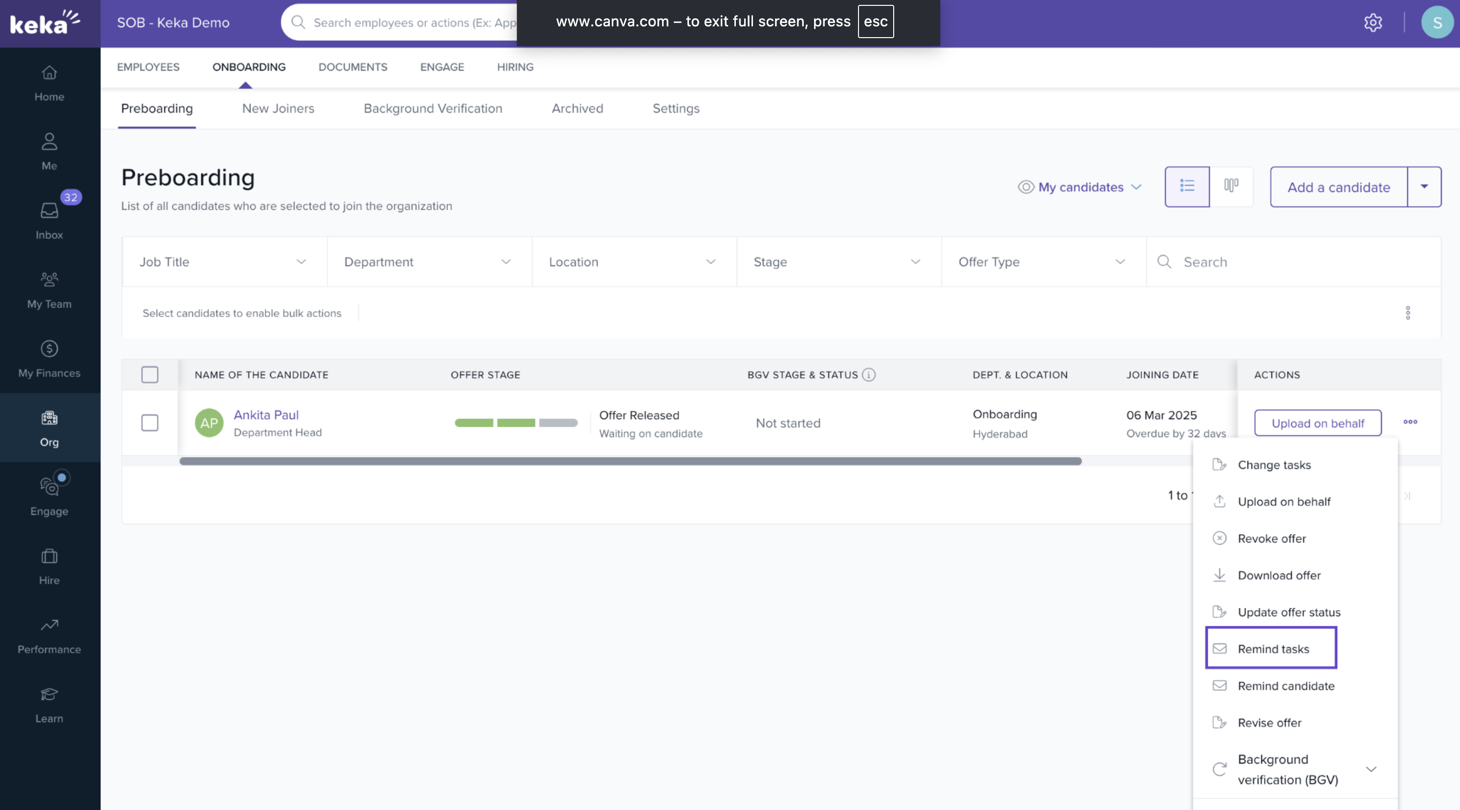 Admins often need to track which documents a candidate has submitted for Background Verification (BGV) and which are still pending. Keka HIRE provides a simple interface to monitor document submission and send reminders if needed.