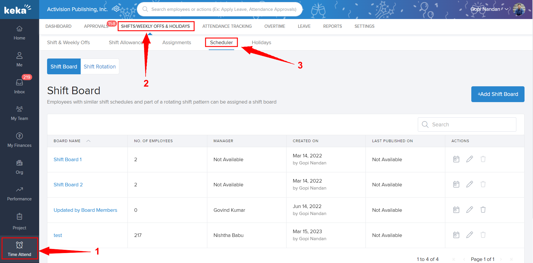 To access the Scheduler feature, navigate to Time Attend (1), then go to Shifts/Weekly Offs & Holidays (2) and open the Scheduler (3) tab.
