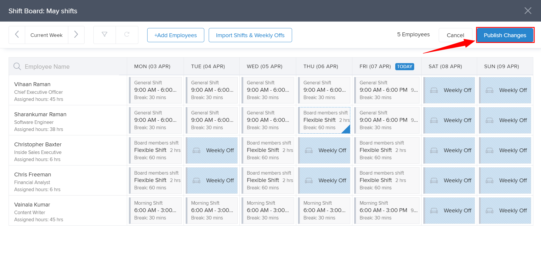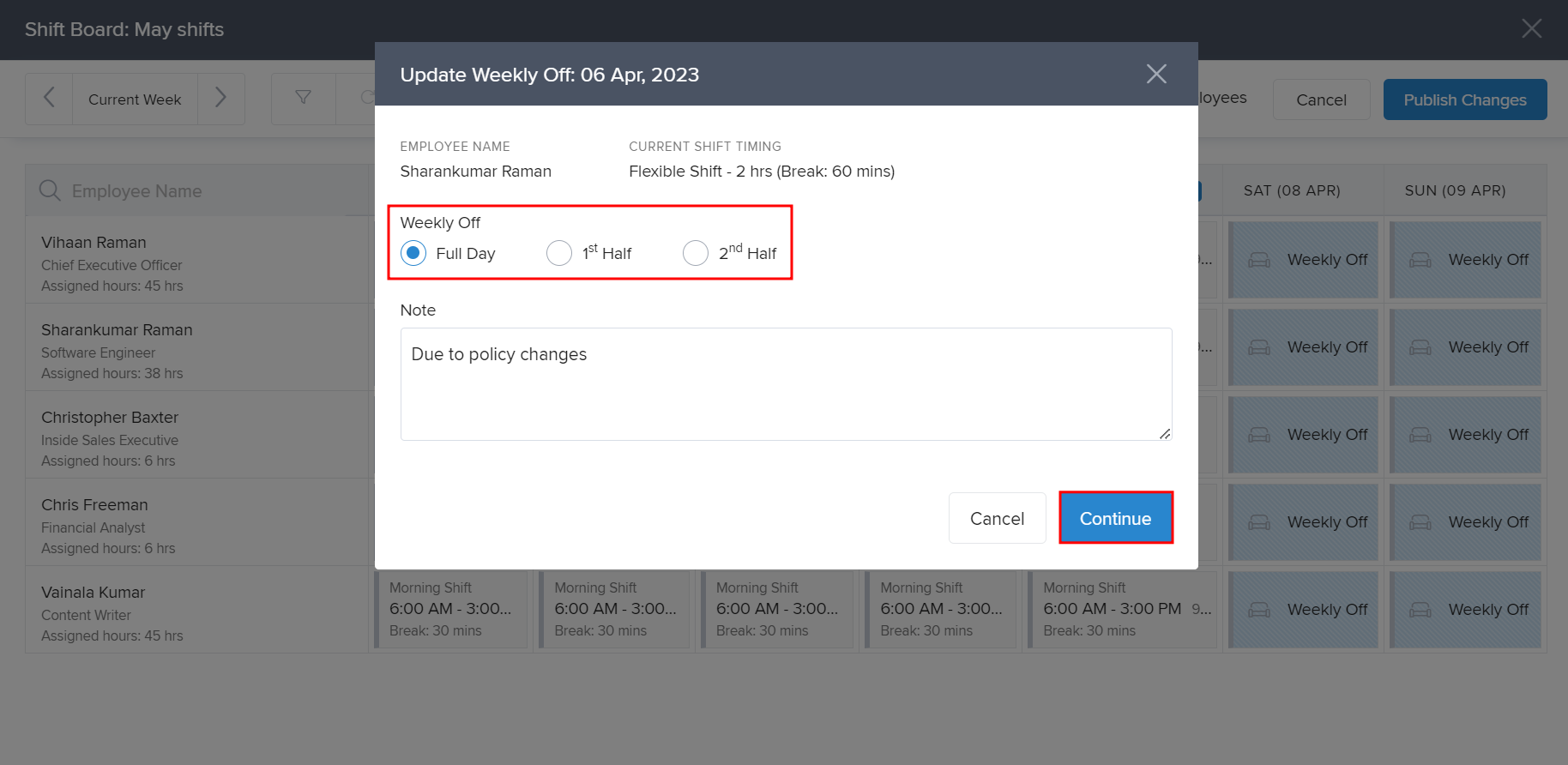 Based on the configurations made while creating the shift board, you can either assign a predefined shift/weekly off or give timing the same. A note regarding this change is also required.
