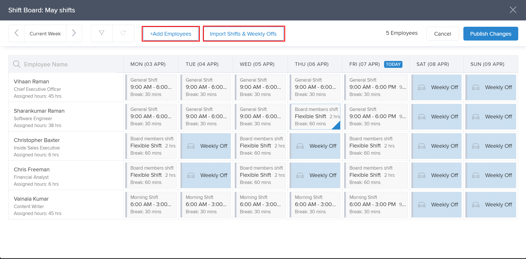 And to change the shifts and weekly offs for multiple employees, click on Import Shifts & Weekly Offs to use Excel to bulk import the new assignments.