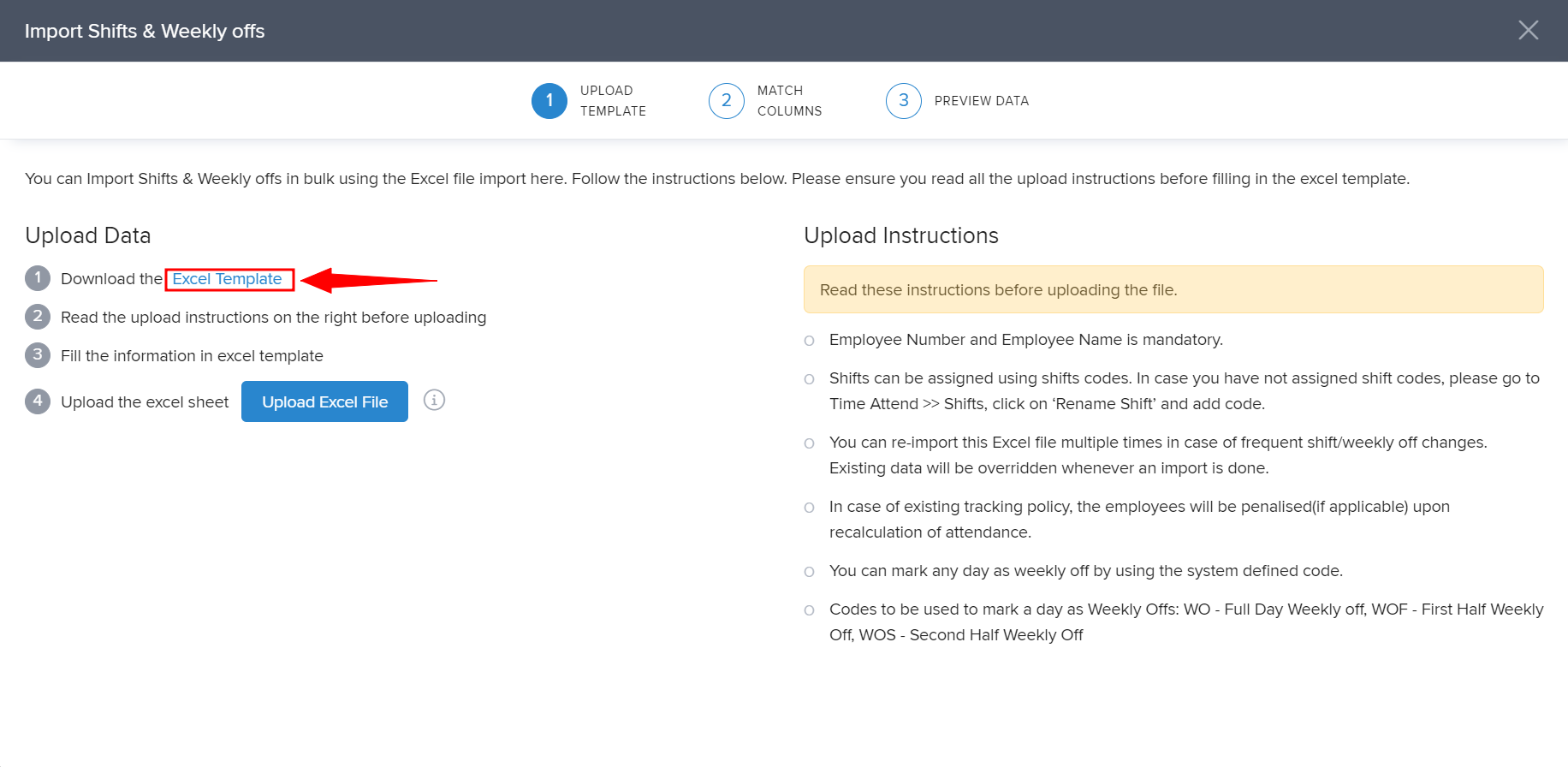 From the window that opens up, download the Excel Template which will have all the current shifts & weekly off-assignment data of the employees of this shift board.