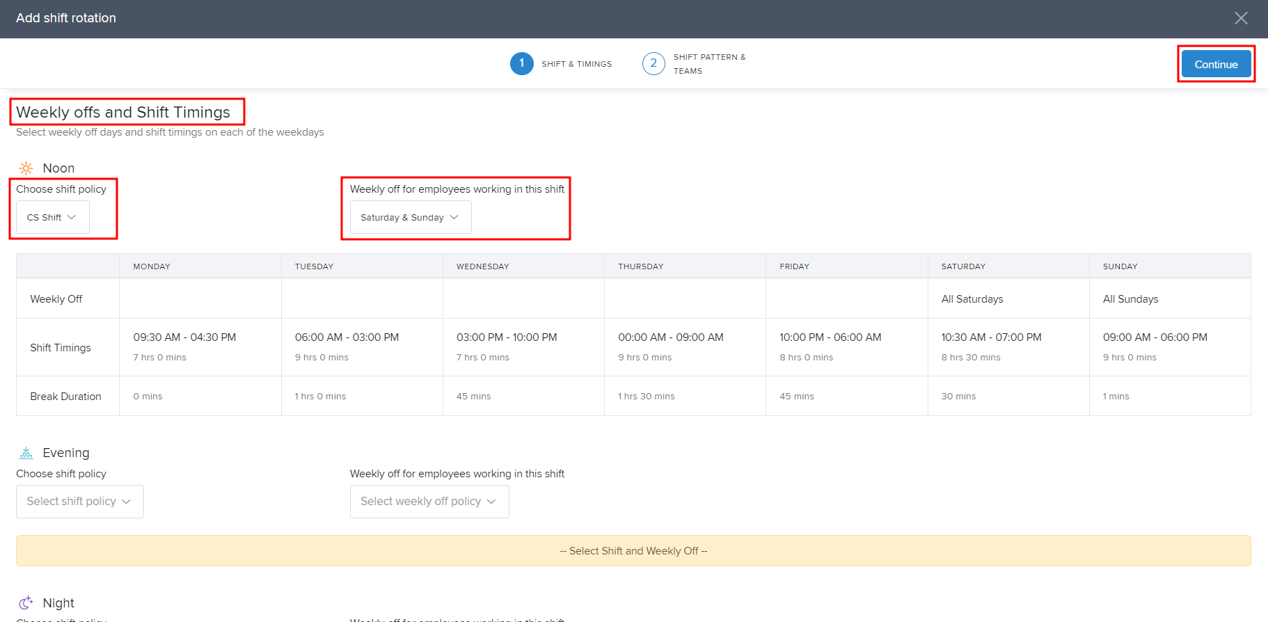 Once done, click Continue to proceed to the Shift Pattern & Teams section.