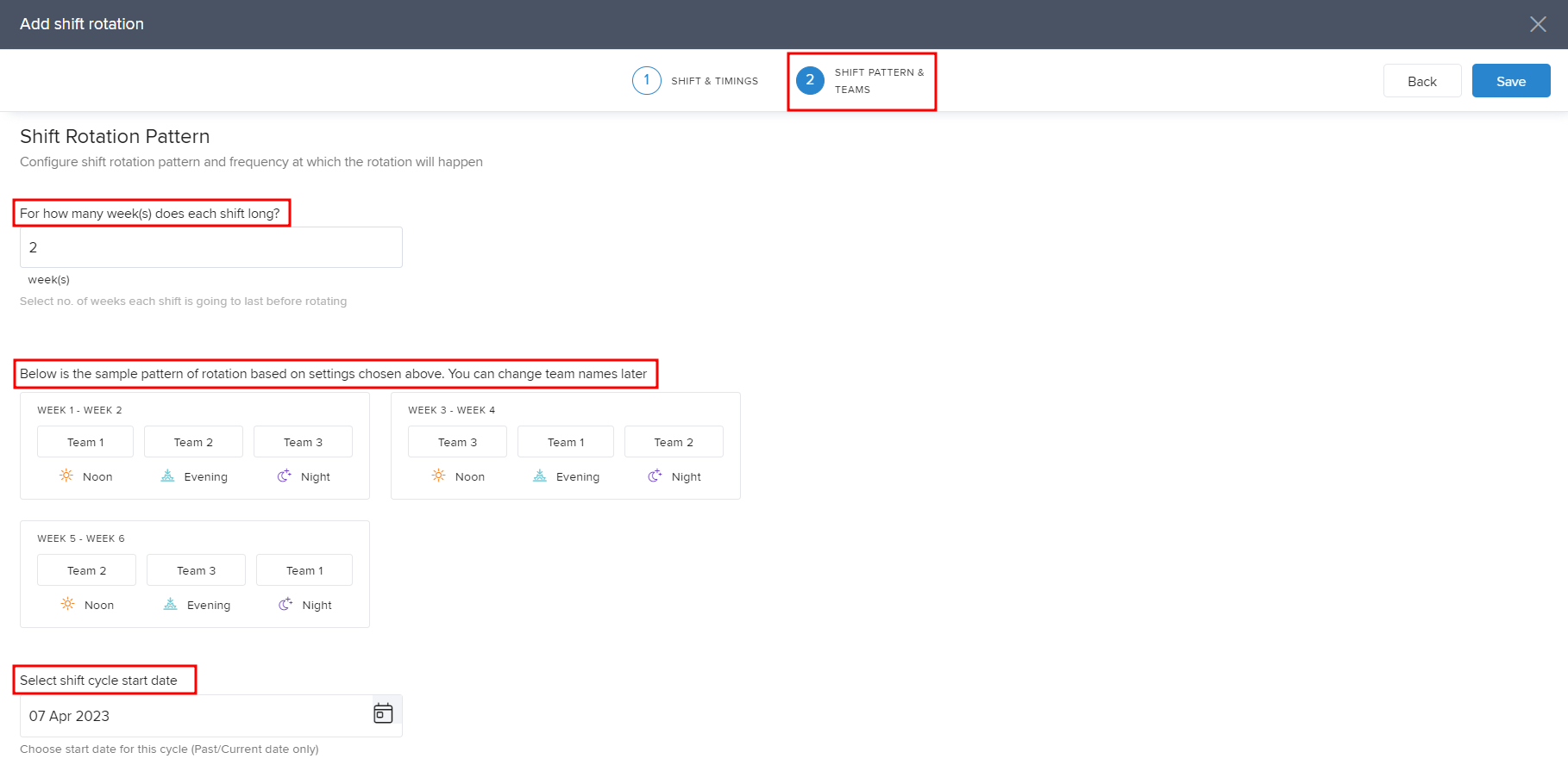 Next, you have to give the number of shifts that will be part of this rotation schedule. And you can set a different Name and Icon for each shift.