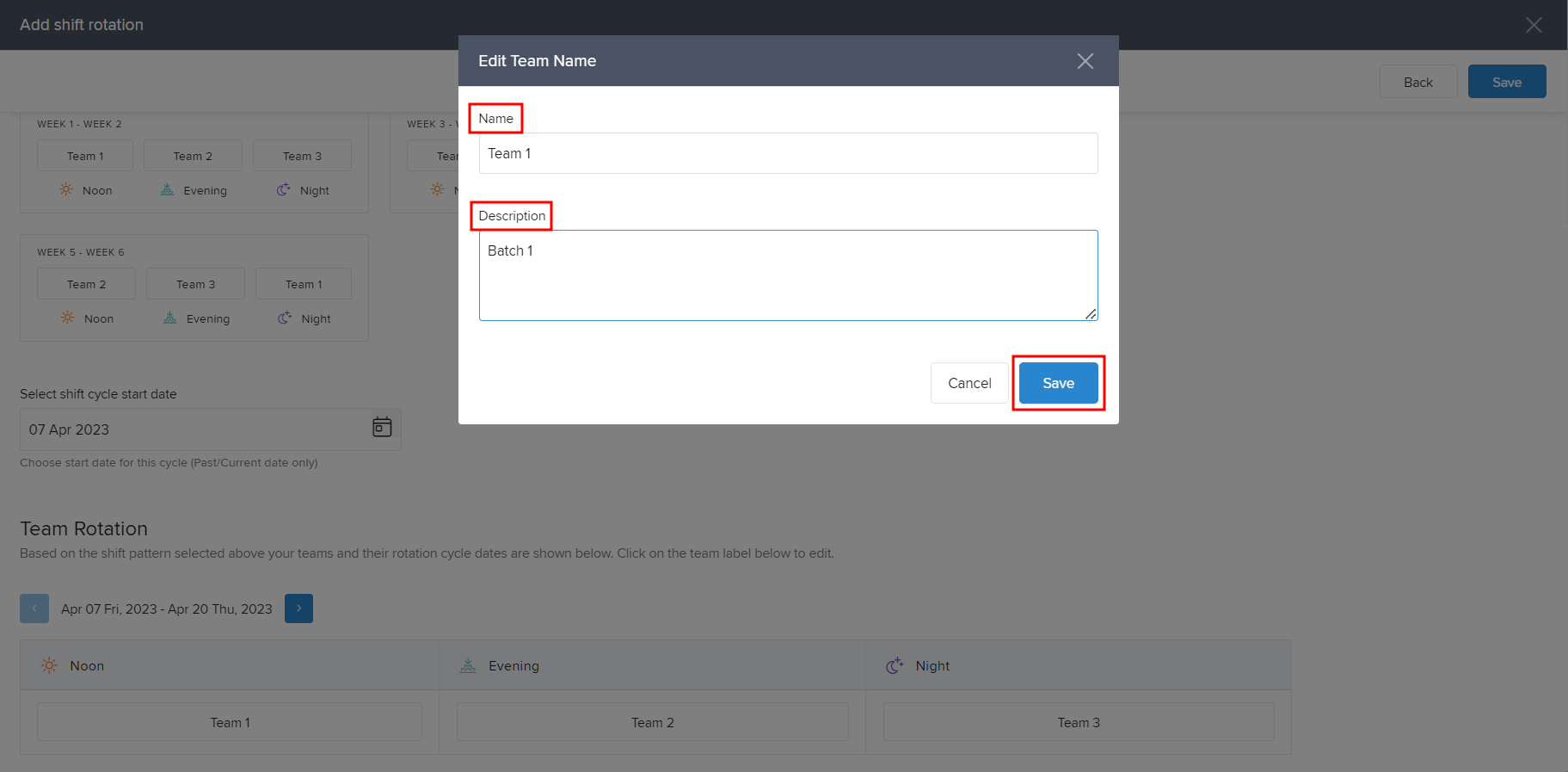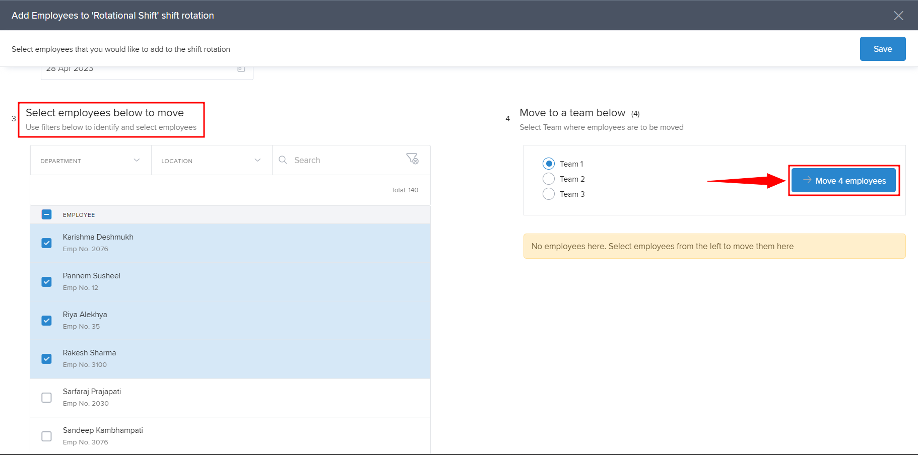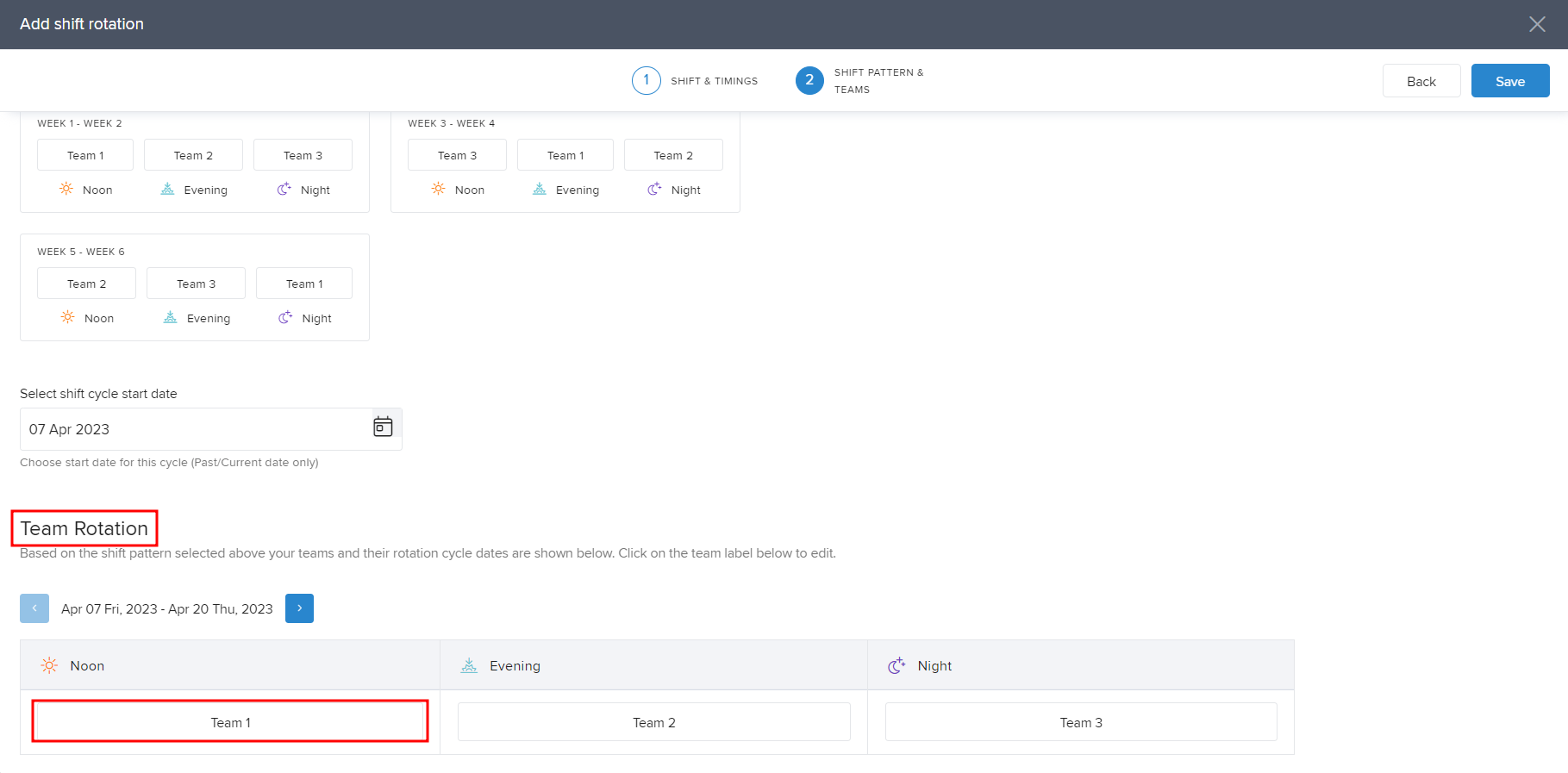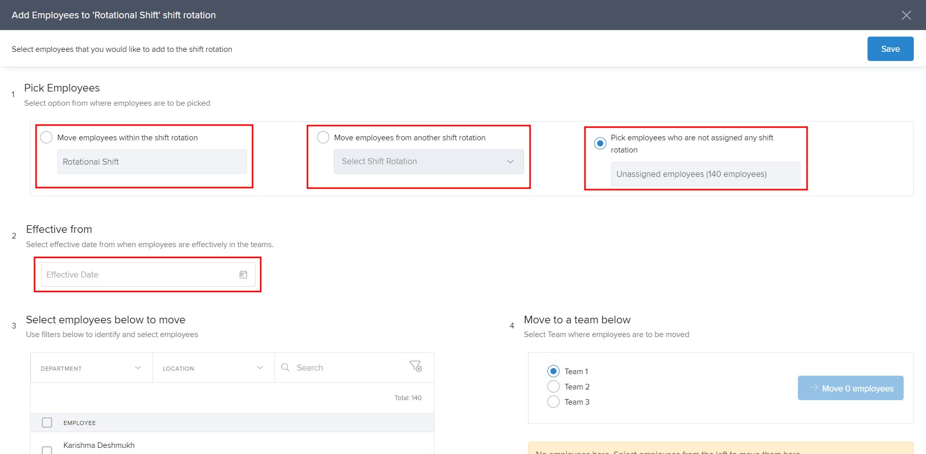 After assigning employees to all the teams, click Save and this Shift Rotation will start from the effective date configured previously.