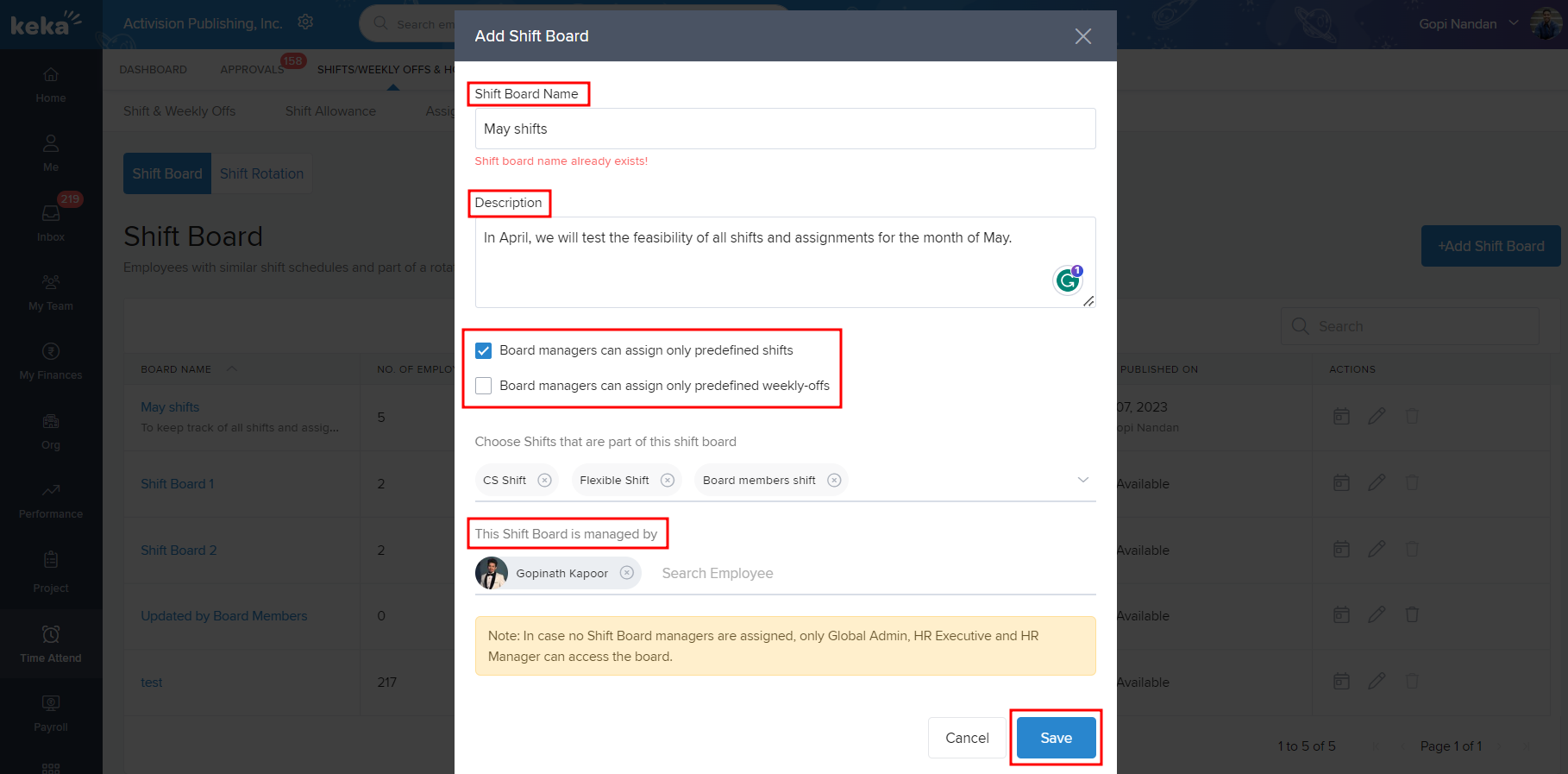 Enable the 'Board managers can assign only predefined shifts' and 'Board managers can assign only weekly-offs' options to use already configured shift policies and weekly offs in this board.