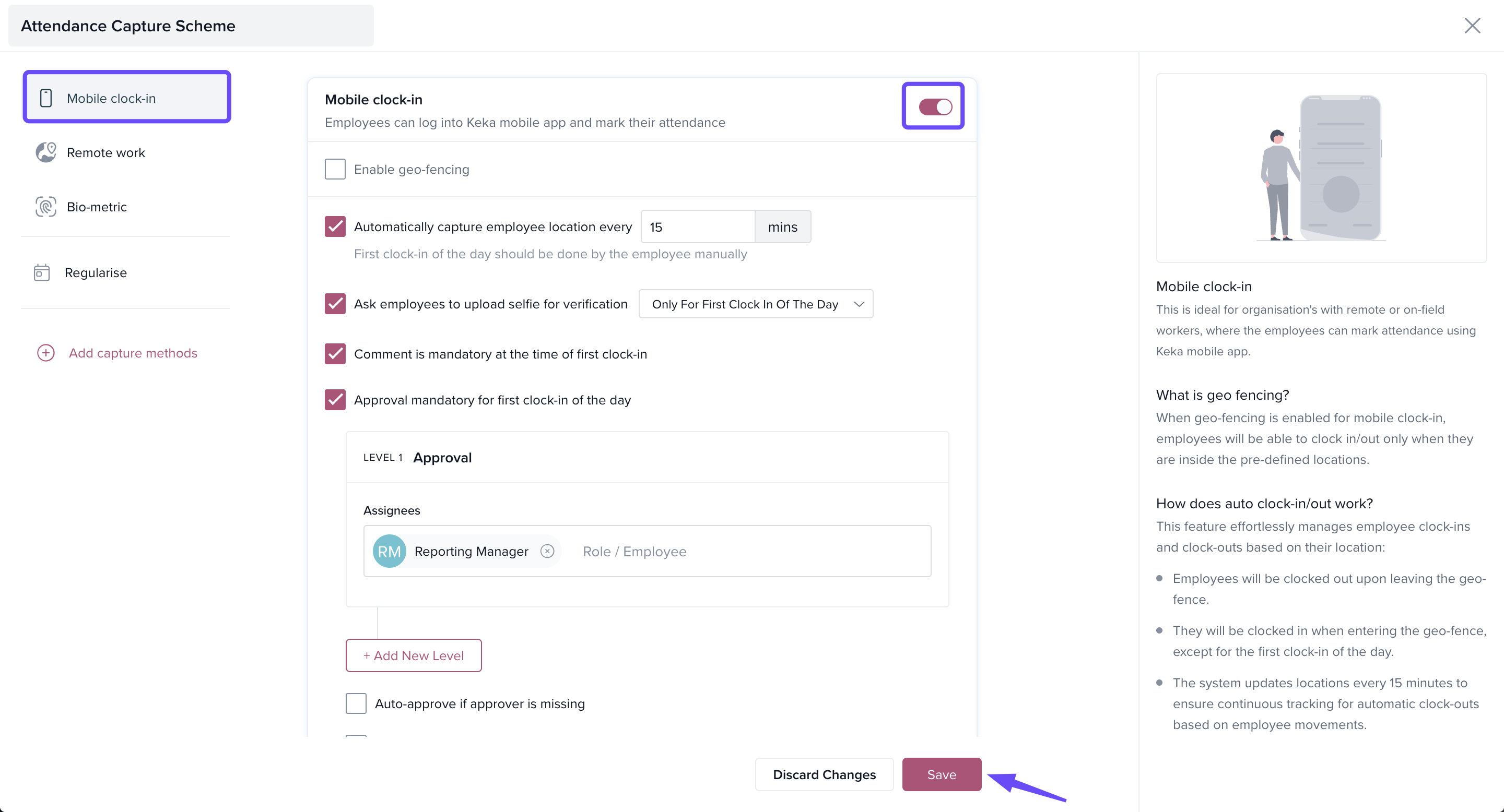In the pop-up window, scroll to the Mobile clock-in section.