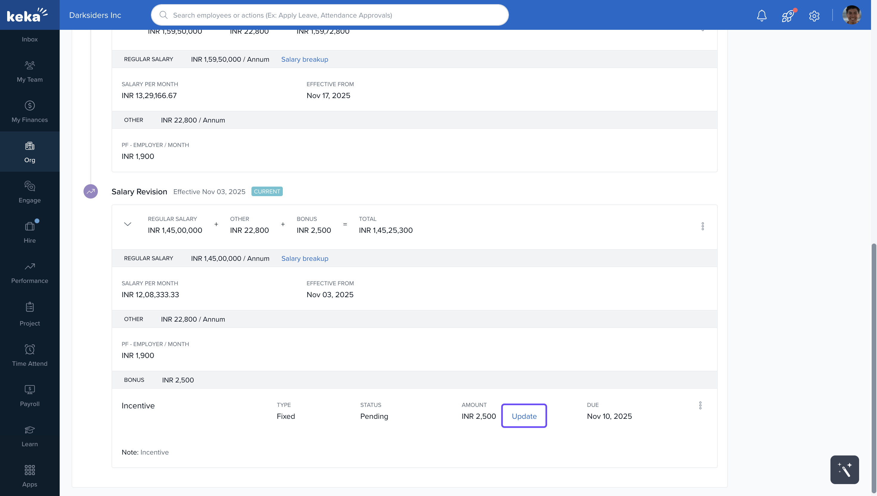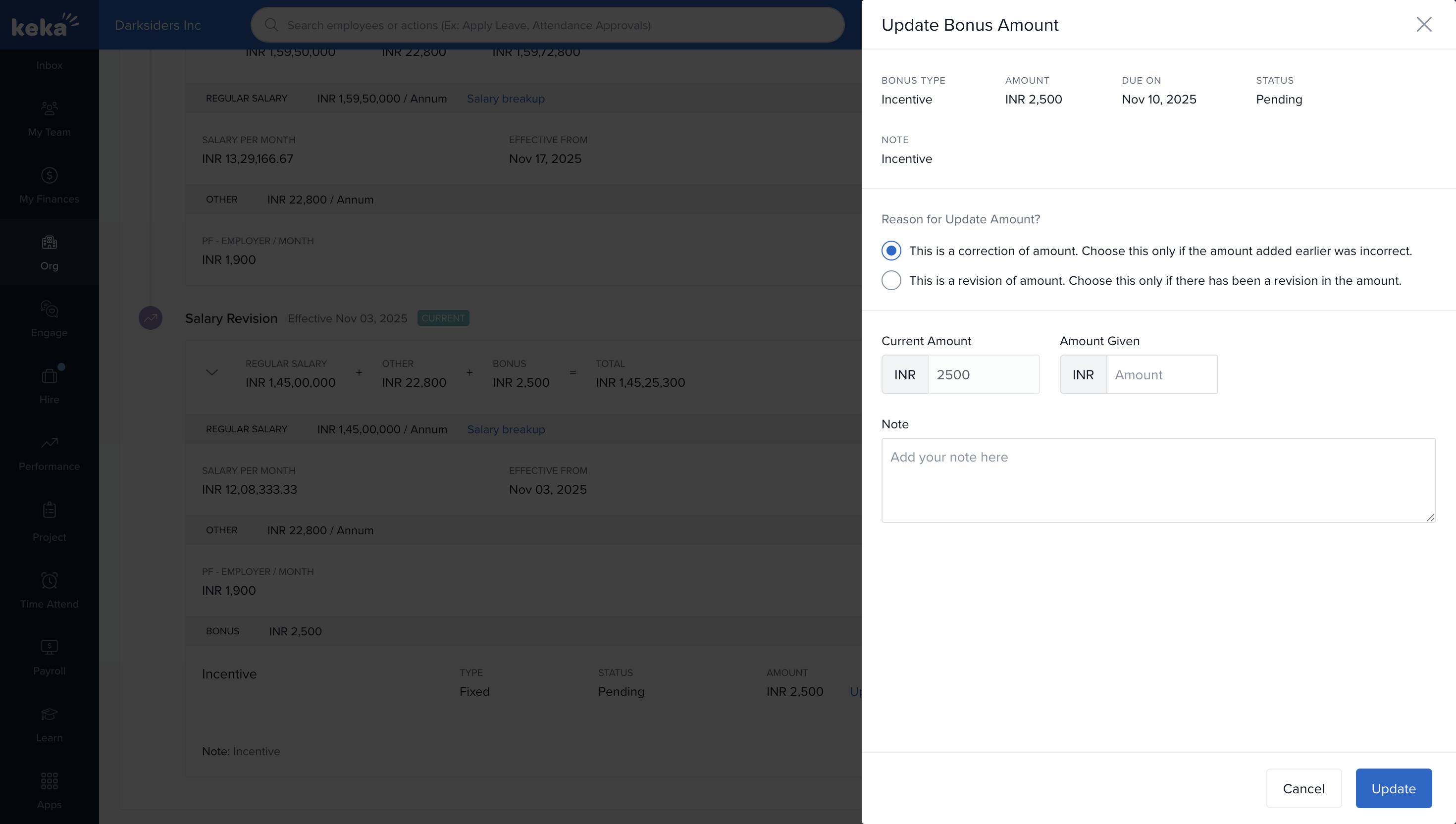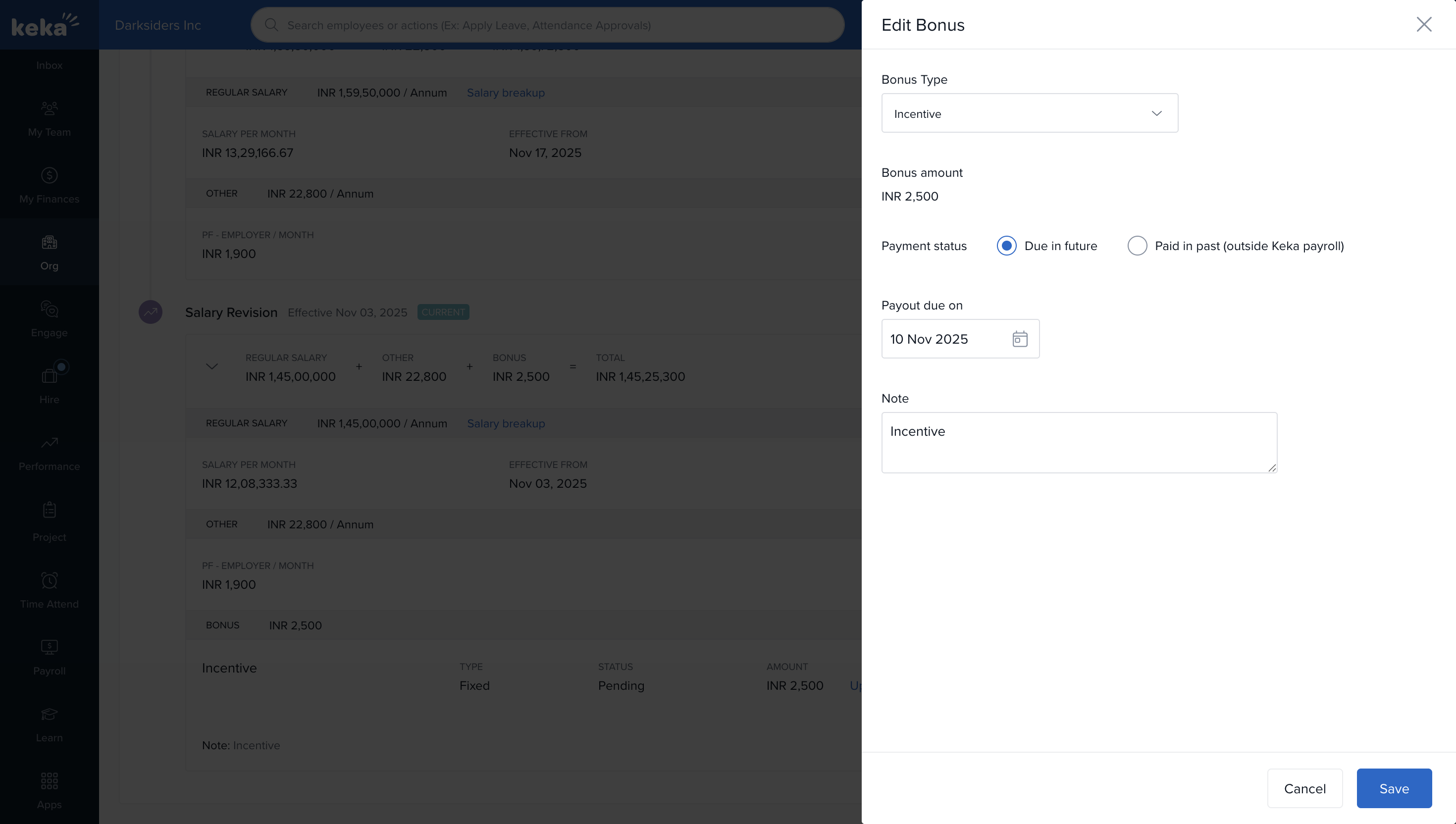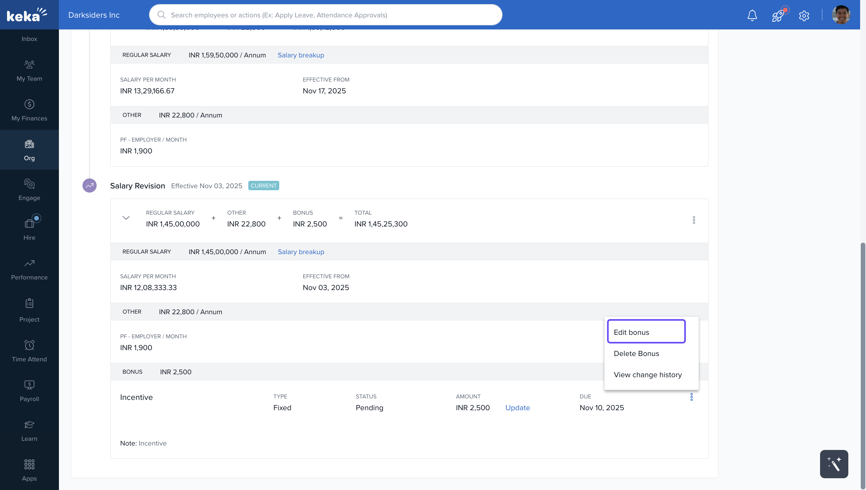 A bonus is an extra payment included in an employee’s CTC. Sometimes, you may need to edit or delete a bonus — for example, if the employee becomes ineligible or if the payout details change.