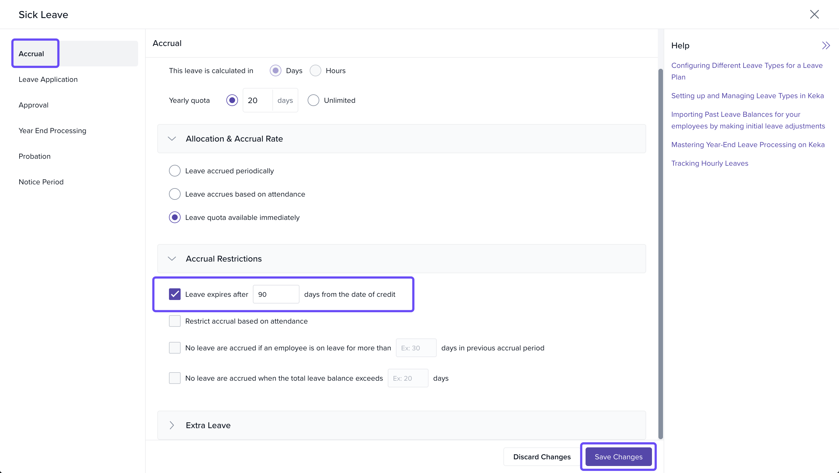 - Enable the option "Leave expires after 'X' days from the date of credit."