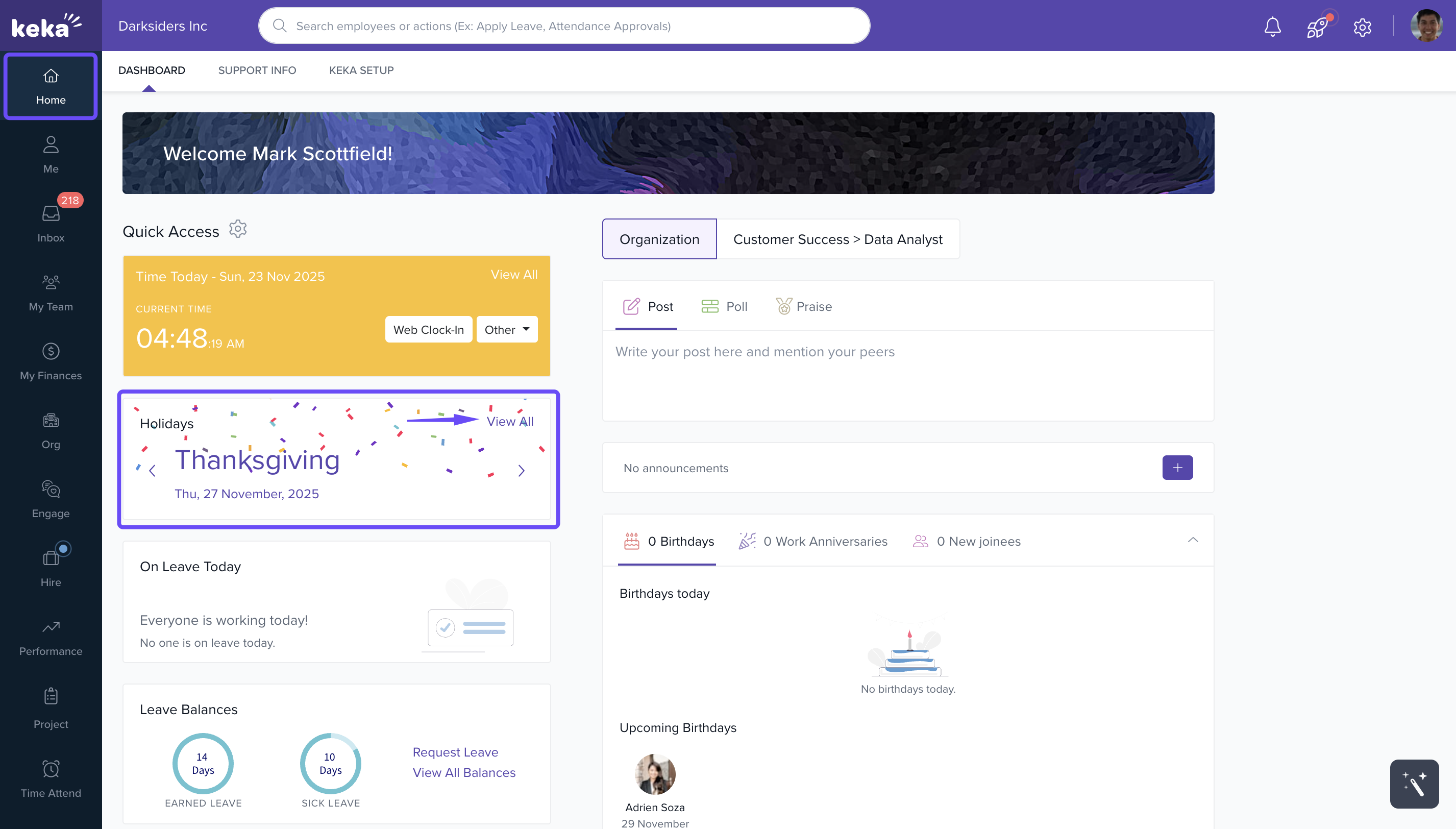Go to the Home screen of your Keka portal.Locate the Holidays widget.Click View All to see the complete list of holidays for the year. Related articles How to change/update Holiday List for employees? Logging in to Keka Creating a holiday plan for your employees How to upload custom leave policy explaination? Exploring the All-in-One Homepage on Keka's Mobile App Comments 0 comments Please sign in to leave a comment.
