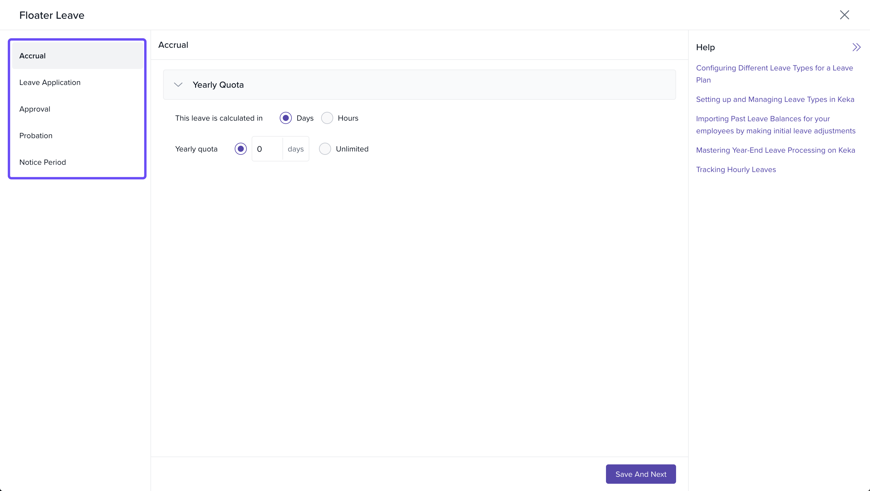 - In the configuration screen, define the Accrual, Leave Application, Approval, Probation, and Notice Period settings as per your requirements.