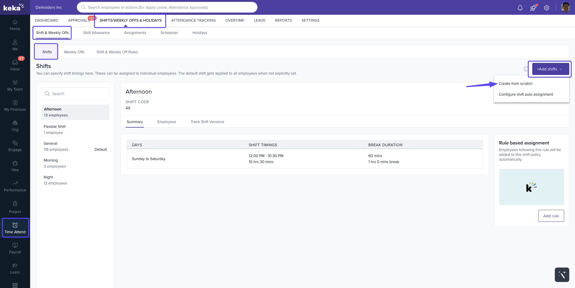By combining fixed shifts with auto-assignment rules, Keka helps you streamline attendance tracking and manage workforce schedules efficiently.