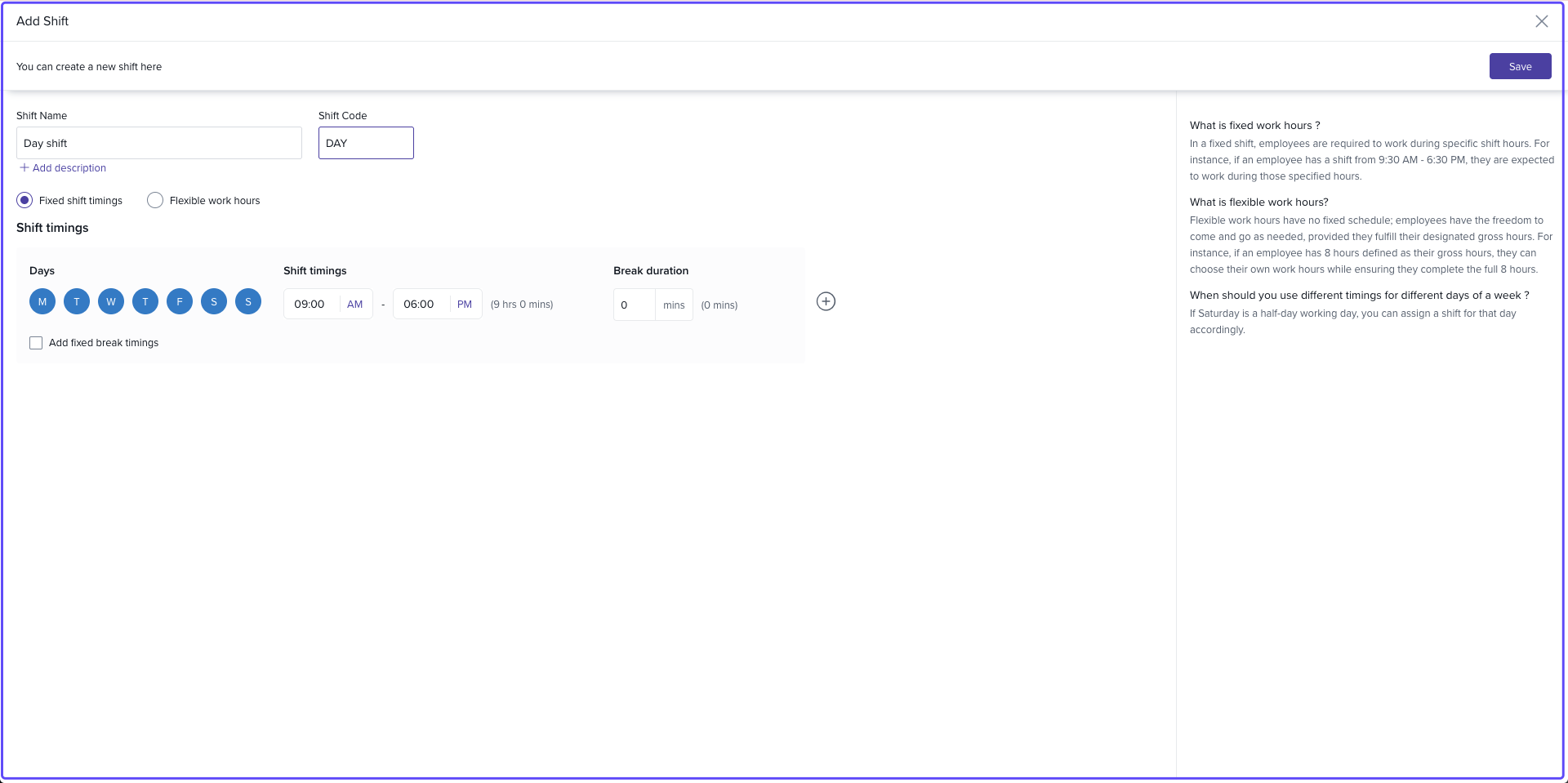 Enter the corresponding shift timing and break duration.