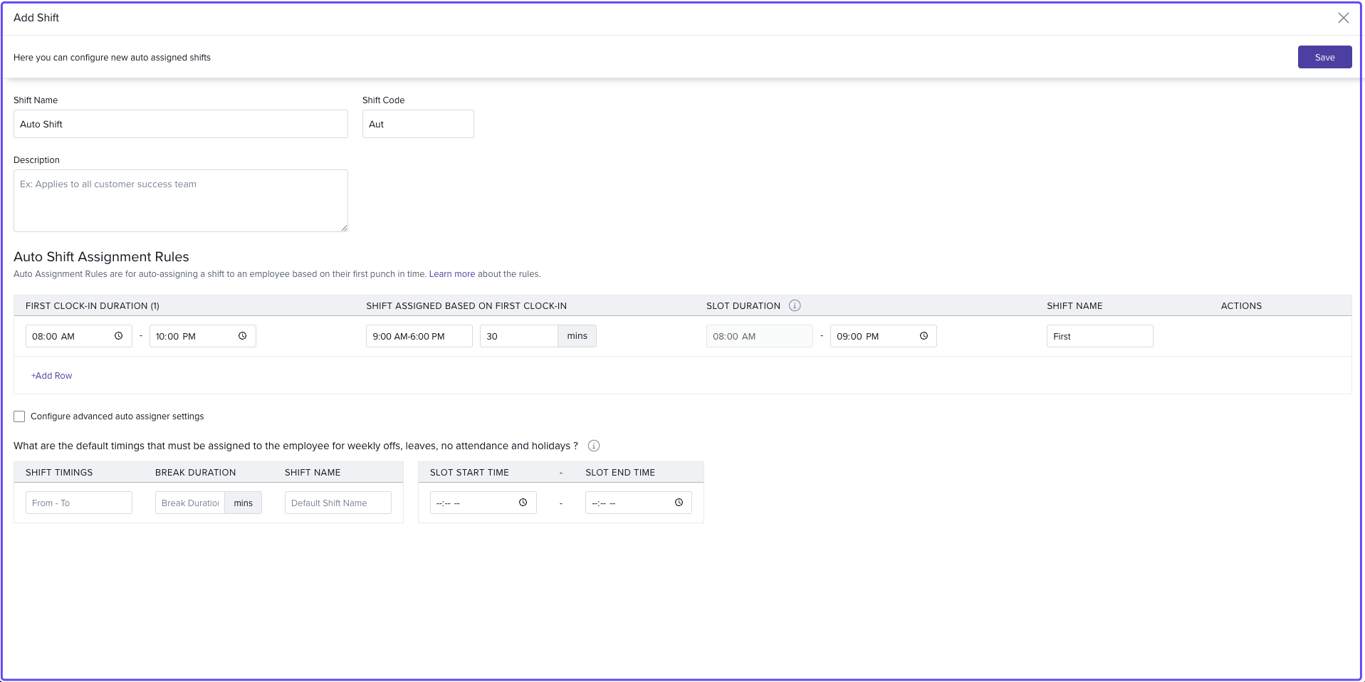 Configure a default shift to cover weekly offs, holidays, and missed clock-ins.