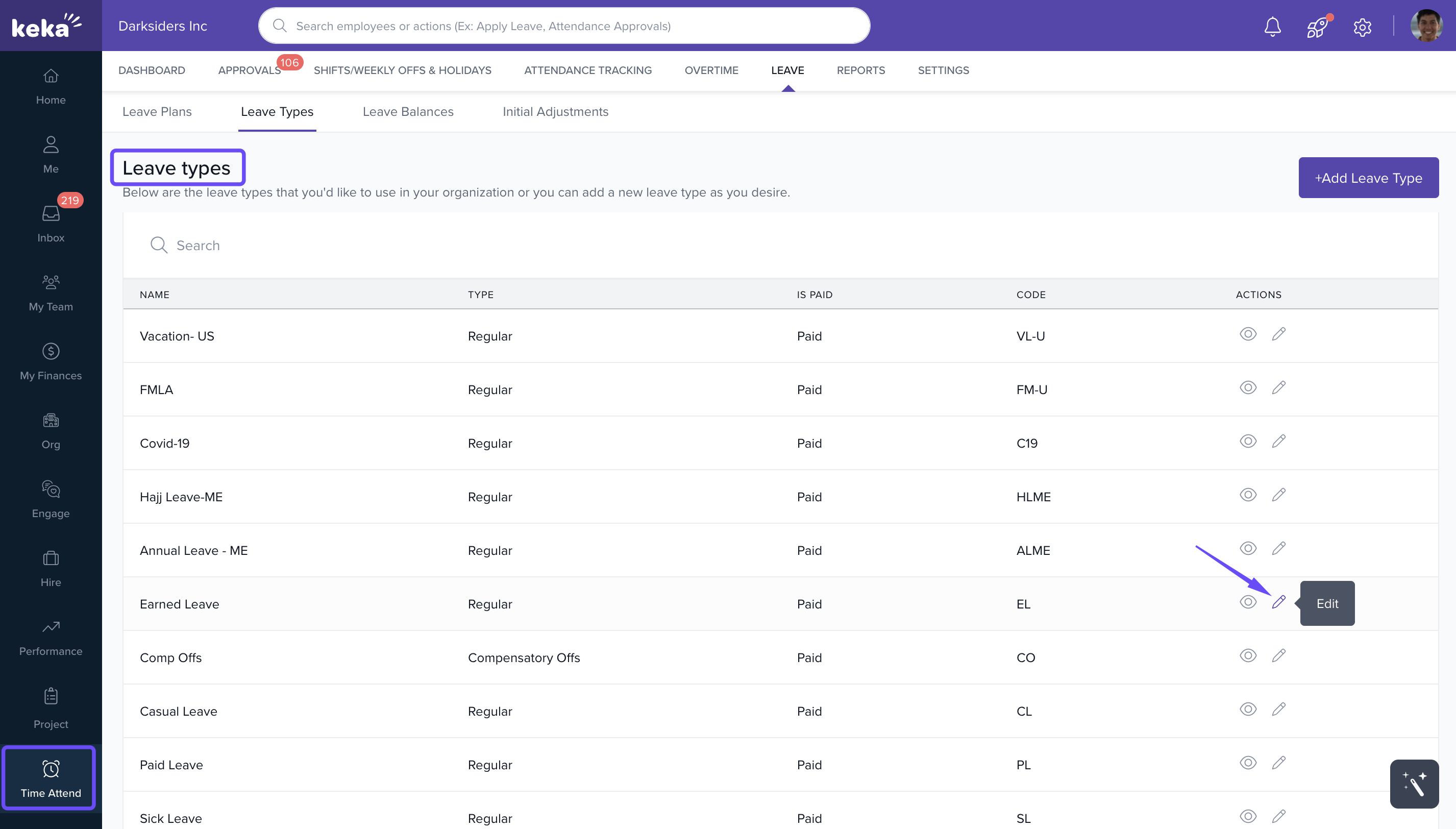 - Select the leave type you wish to edit and click on the edit icon under Actions.
