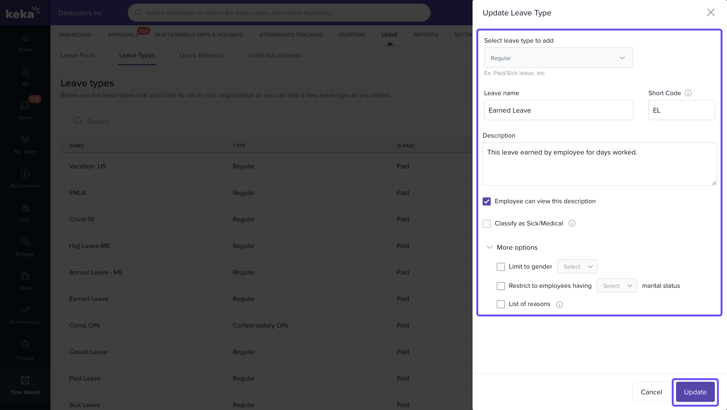 - In the Edit window, you can modify the Name, Short Code, and Description of the leave type.