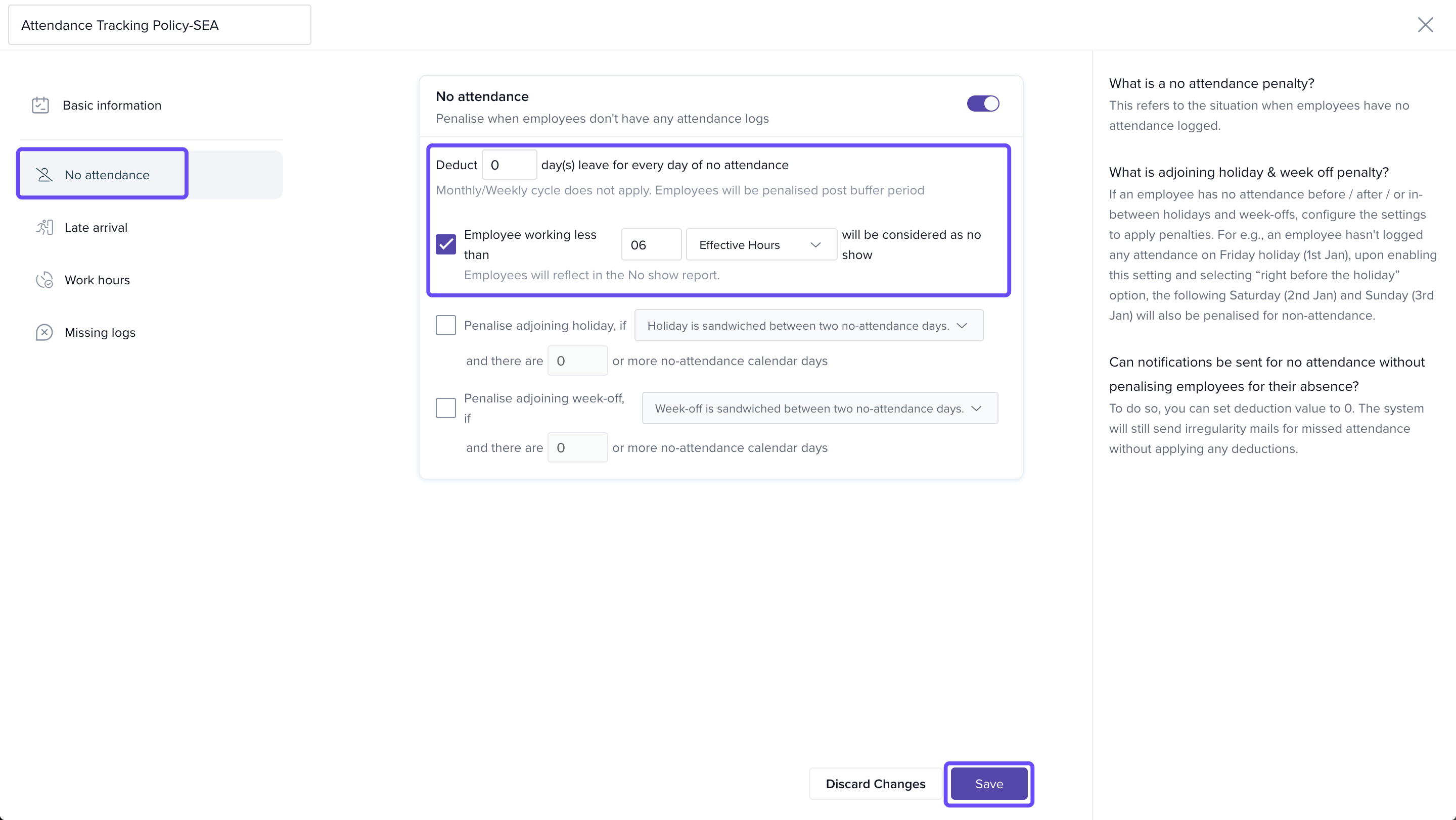 - Navigate to Time Attend > Attendance Tracking > Penalisation Policy.