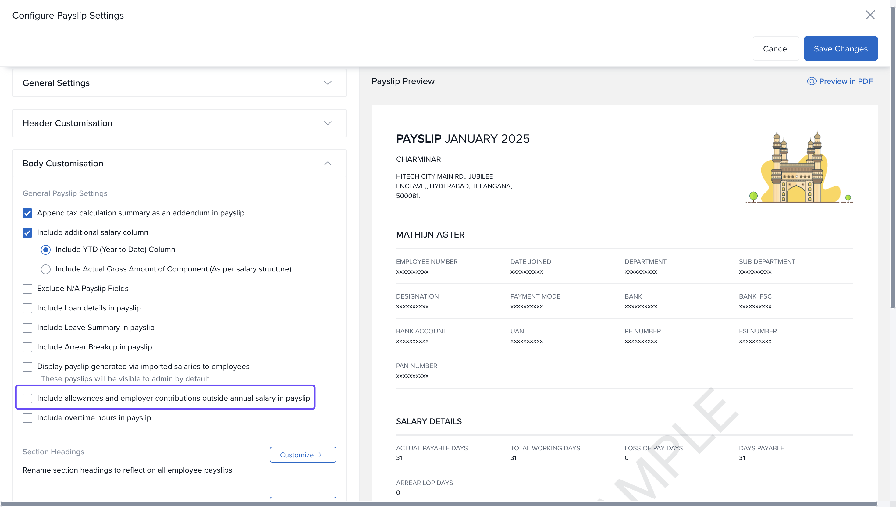 Some components like employer's statutory contributions (PF, ESI, LWF) and allowances may be paid over and above an employee's monthly salary. While these components are part of the employee's CTC, they may not always be included in the gross salary. This feature allows admins to display such components in the employee’s payslip for better clarity.