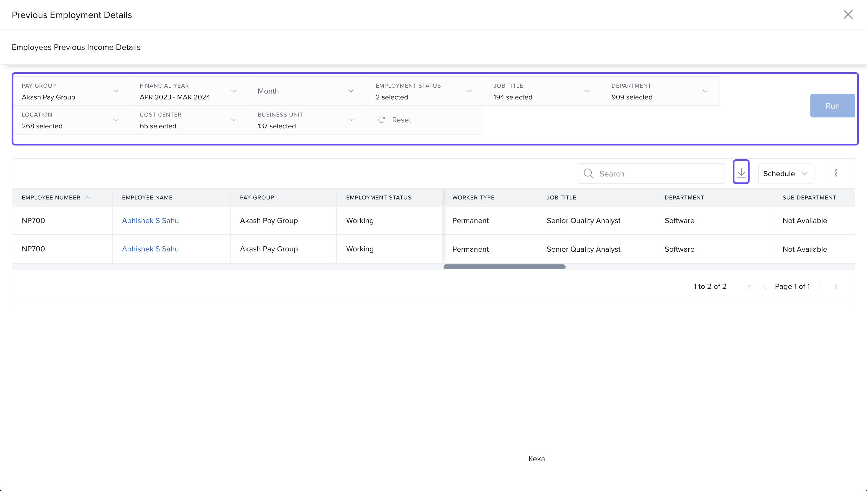Select the required fields such as Pay Group, Financial Year, Month, Employment Status, Job Title, Department, Location, Cost Center, and Business Unit.