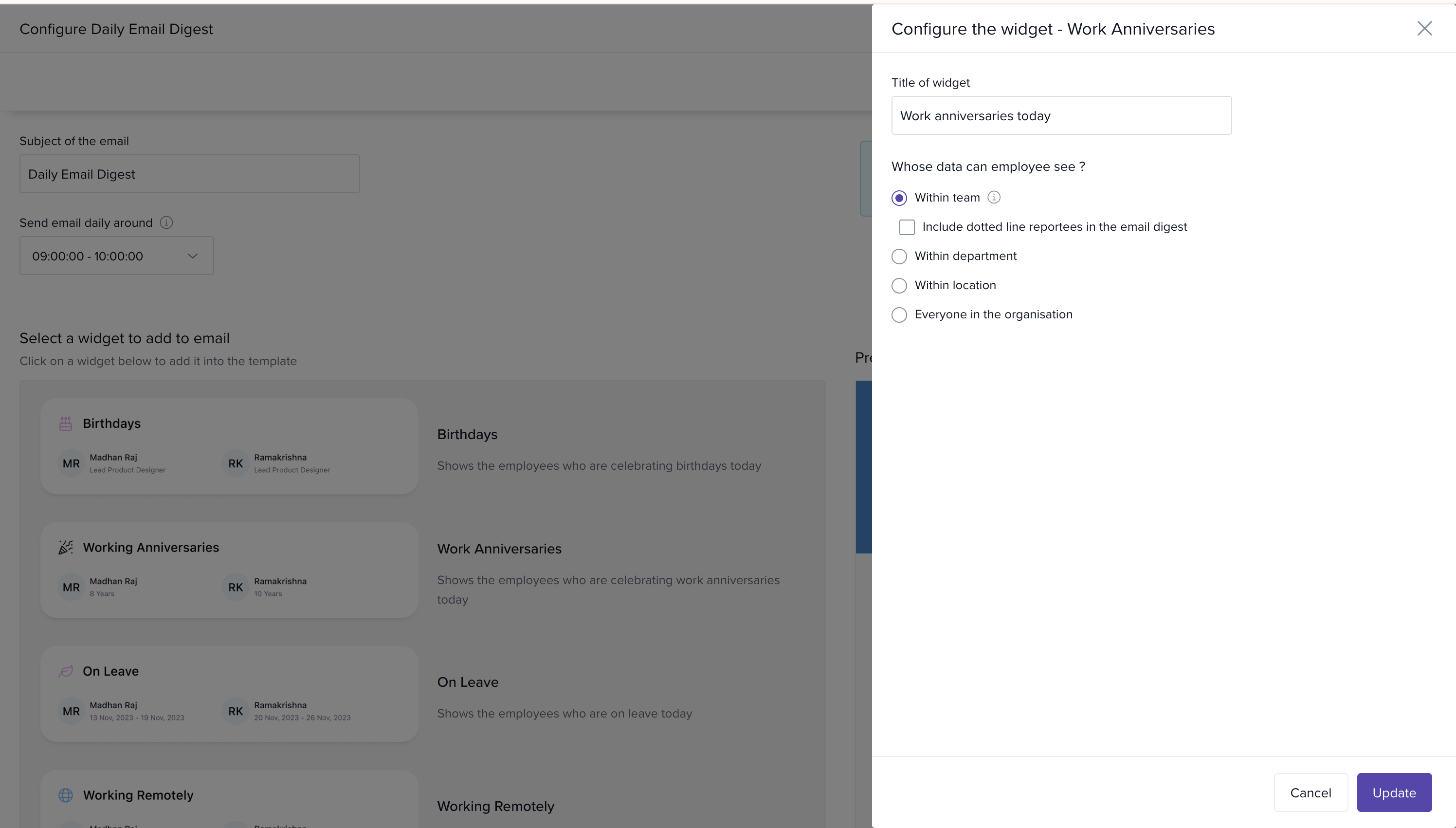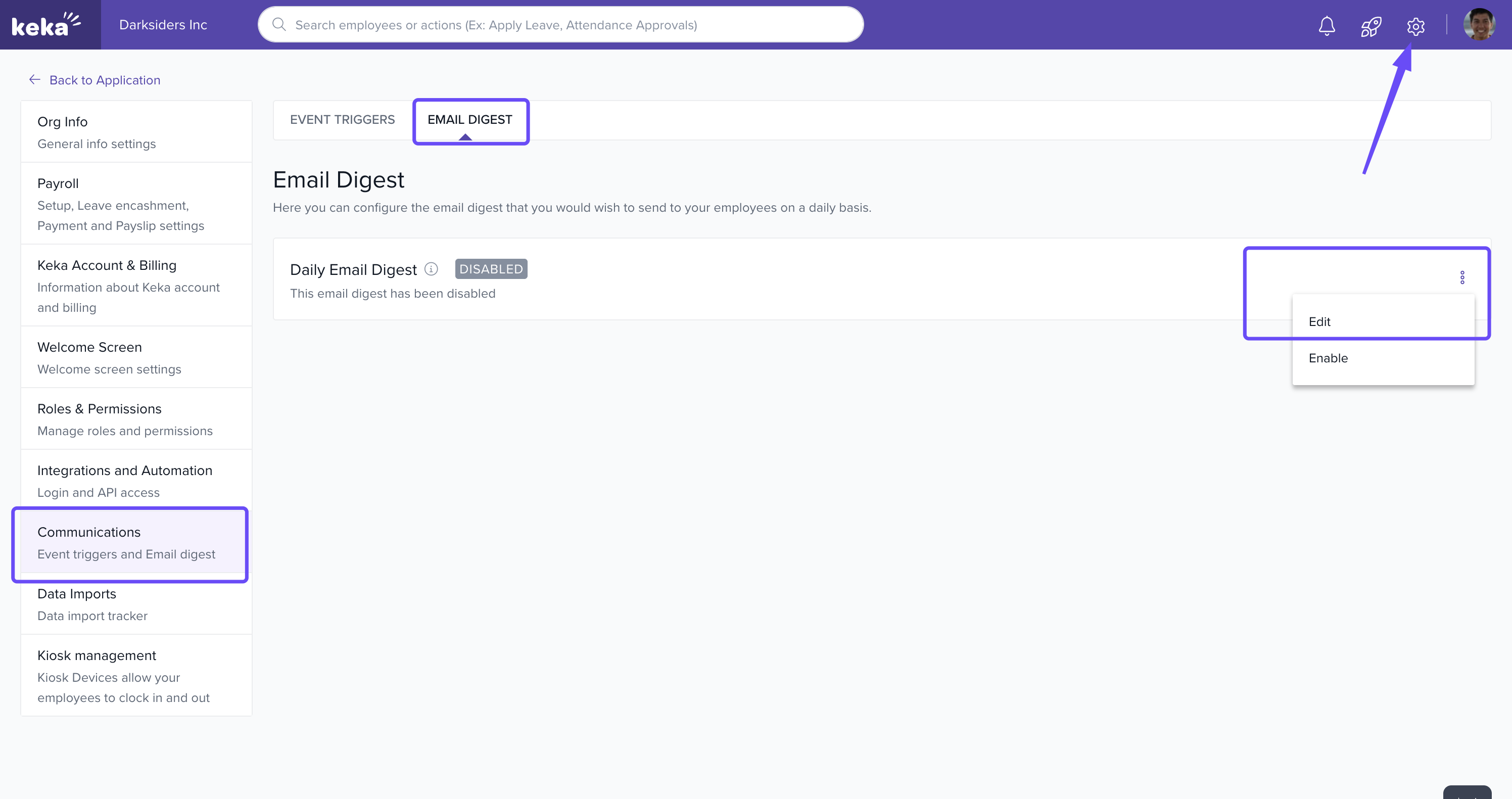 Keka automatically sends a Daily Email Digest to all employees at 9:00 AM, summarizing important updates and events for the day.