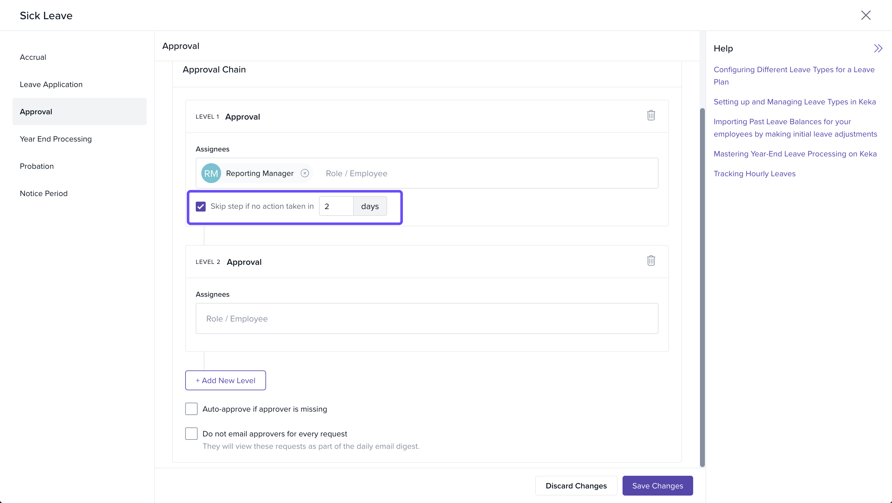 If the option “Auto-approve and skip this level if no action is taken in X days” is turned on, and the approver doesn’t act within the set number of days, the request will automatically move to the next approver.
