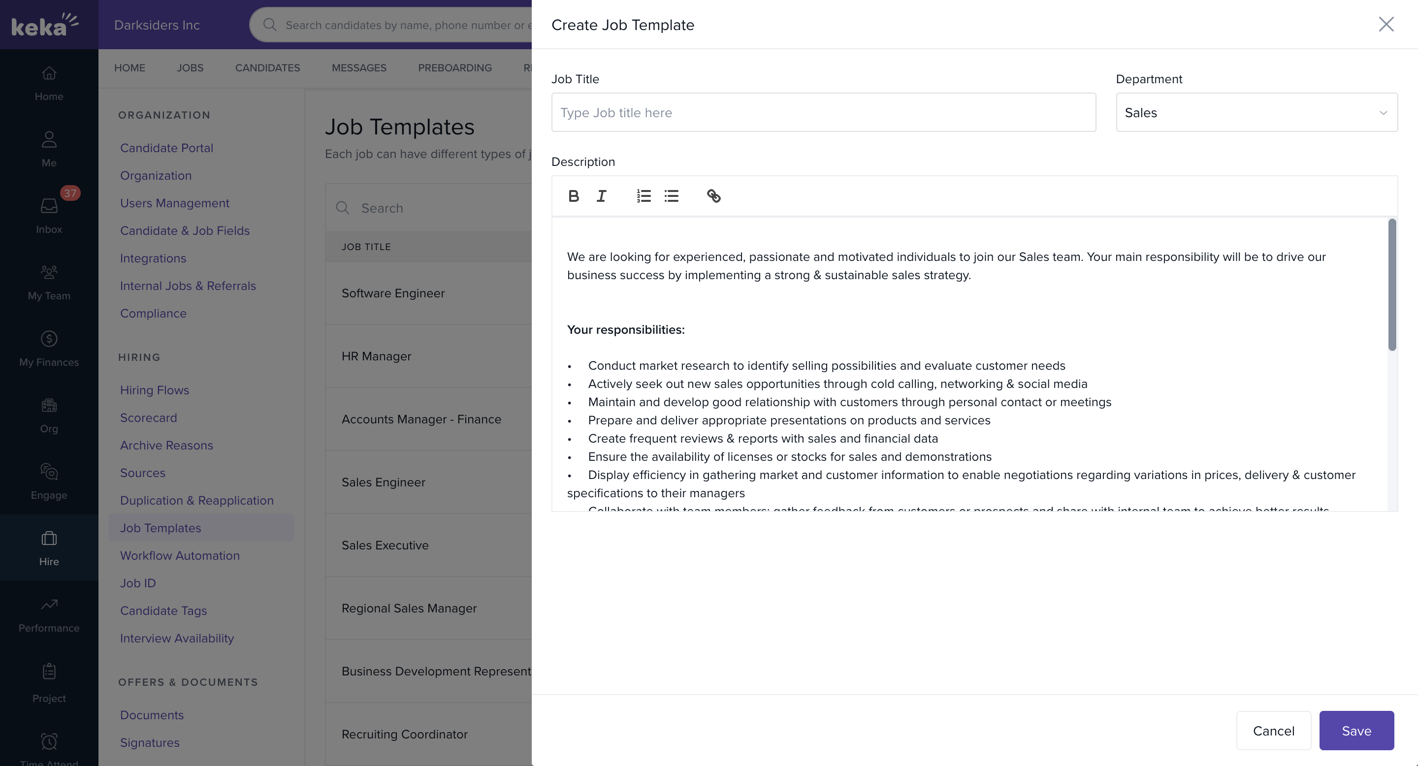Most job descriptions follow a common format. With Keka Hire, you can create reusable job description templates that make it easy to post roles consistently and quickly. Templates are especially useful for recurring roles, where you can start with a base description and customize it as needed.