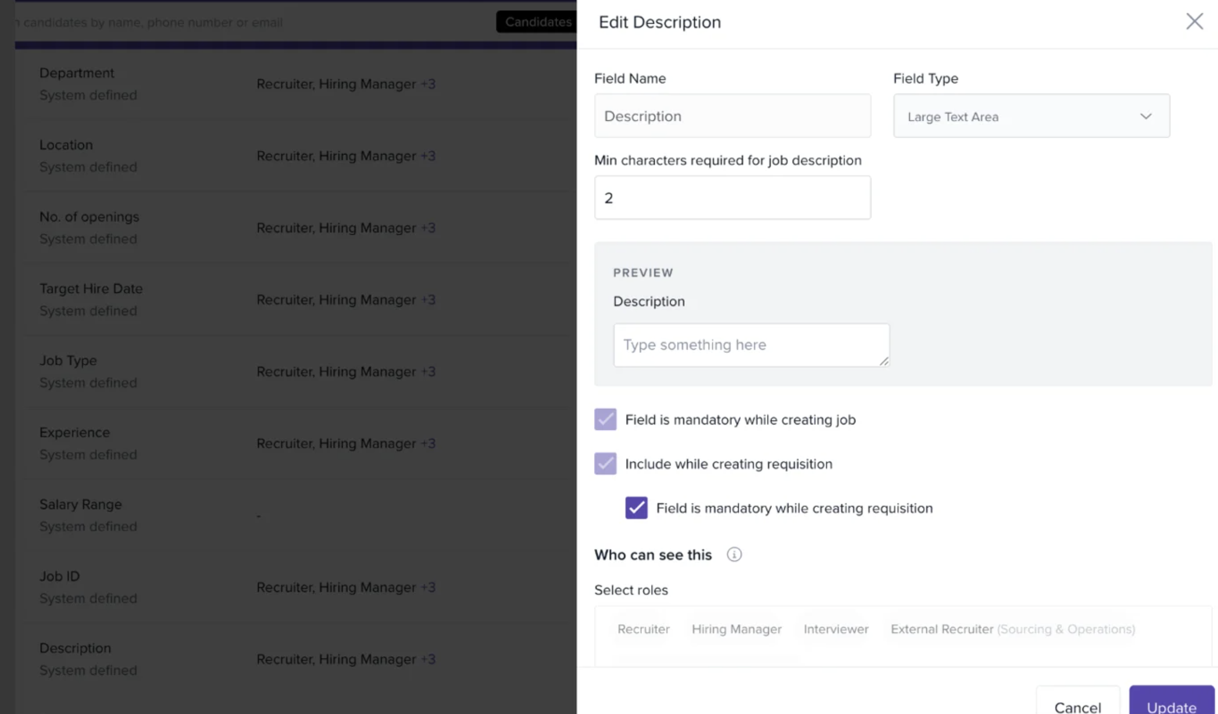 To ensure clarity and consistency across postings, Keka Hire allows admins to enforce a minimum character limit for job descriptions. This prevents overly short or vague descriptions from being published.