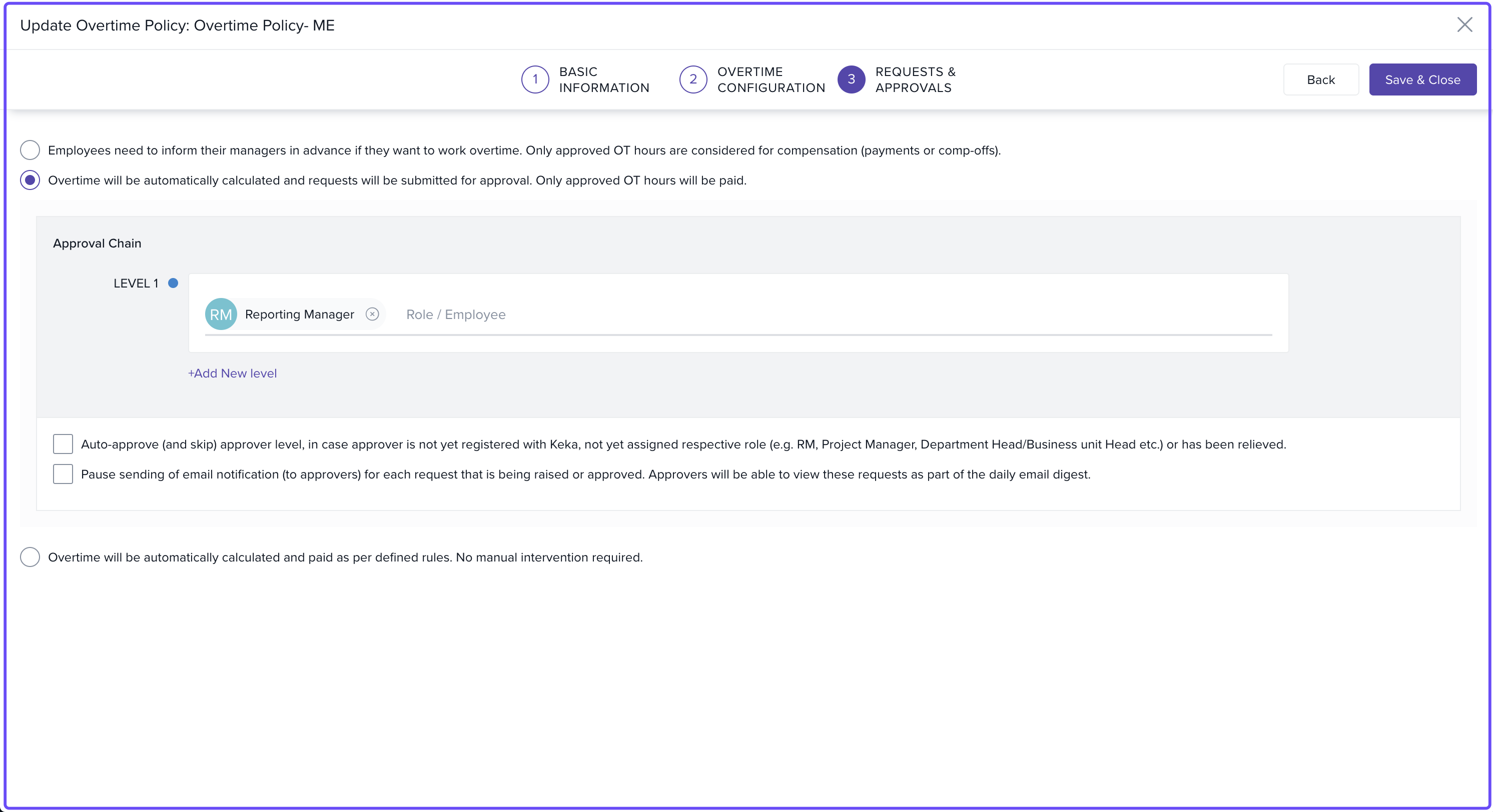 This guide explains how to set up an overtime policy from scratch, including time-based configurations, pay options, and approval workflows.