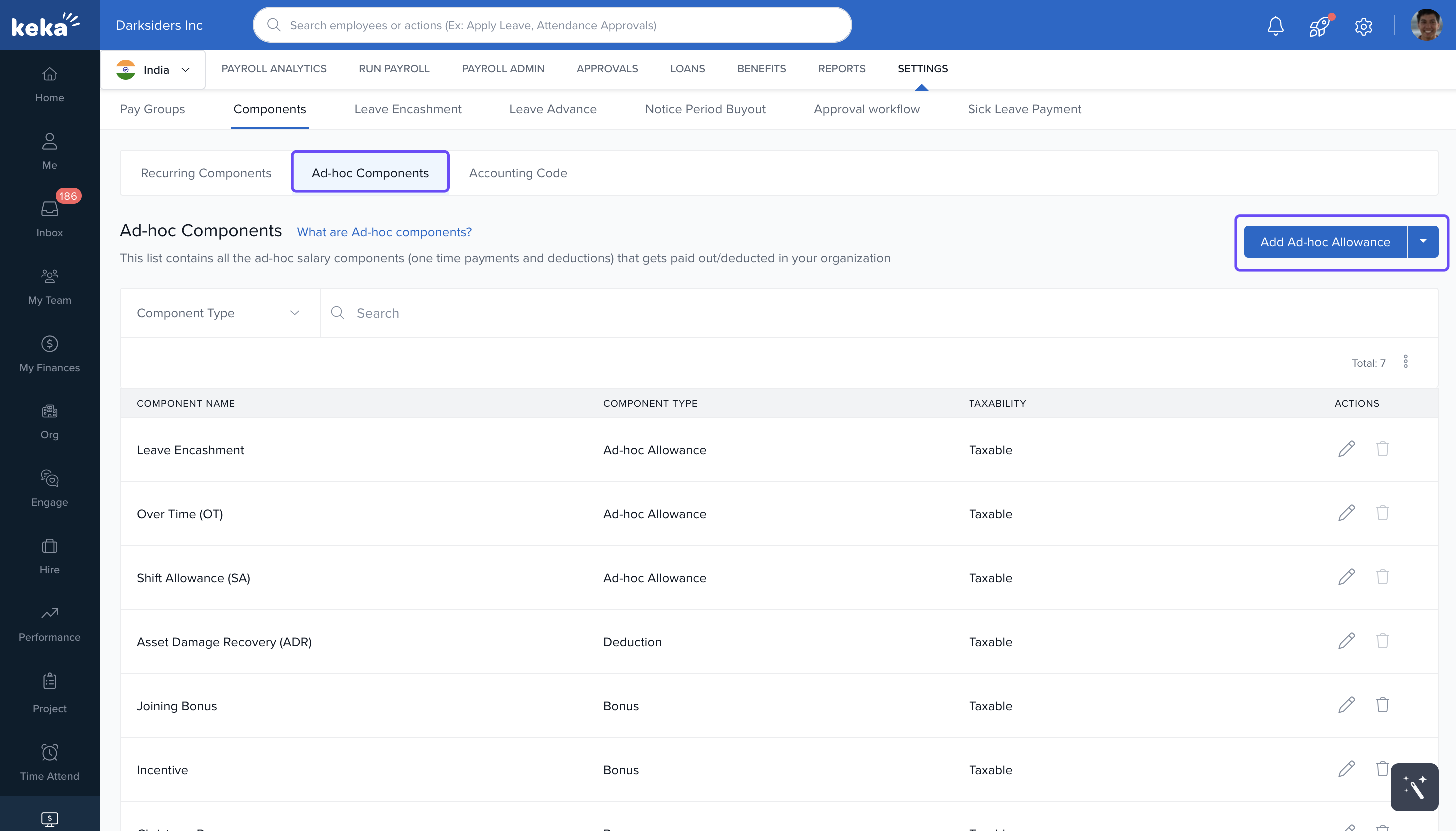 Go to Payroll ➔ Settings ➔ Components ➔ Ad-hoc Components.