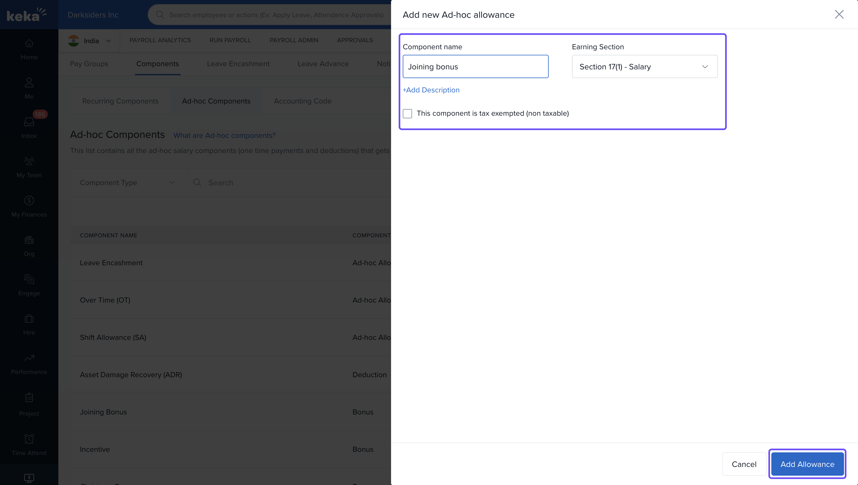 When adding a new salary component in your organization, follow these steps to create and assign it to the appropriate salary structure on the Keka HR portal.