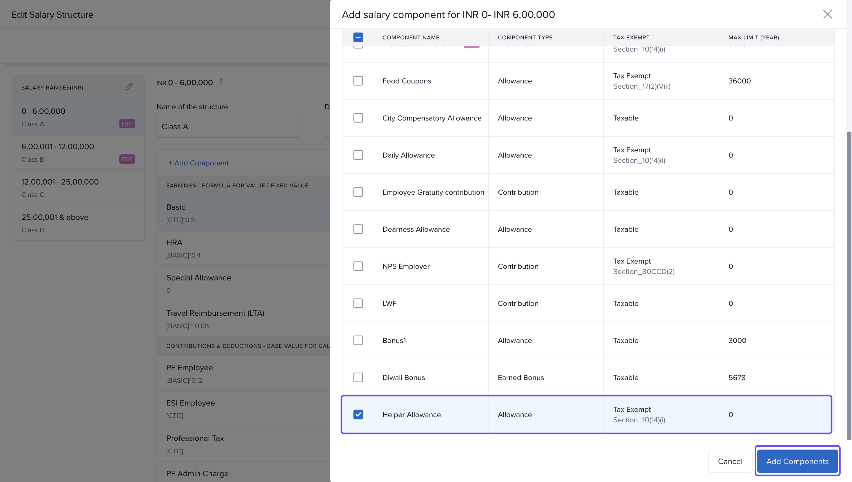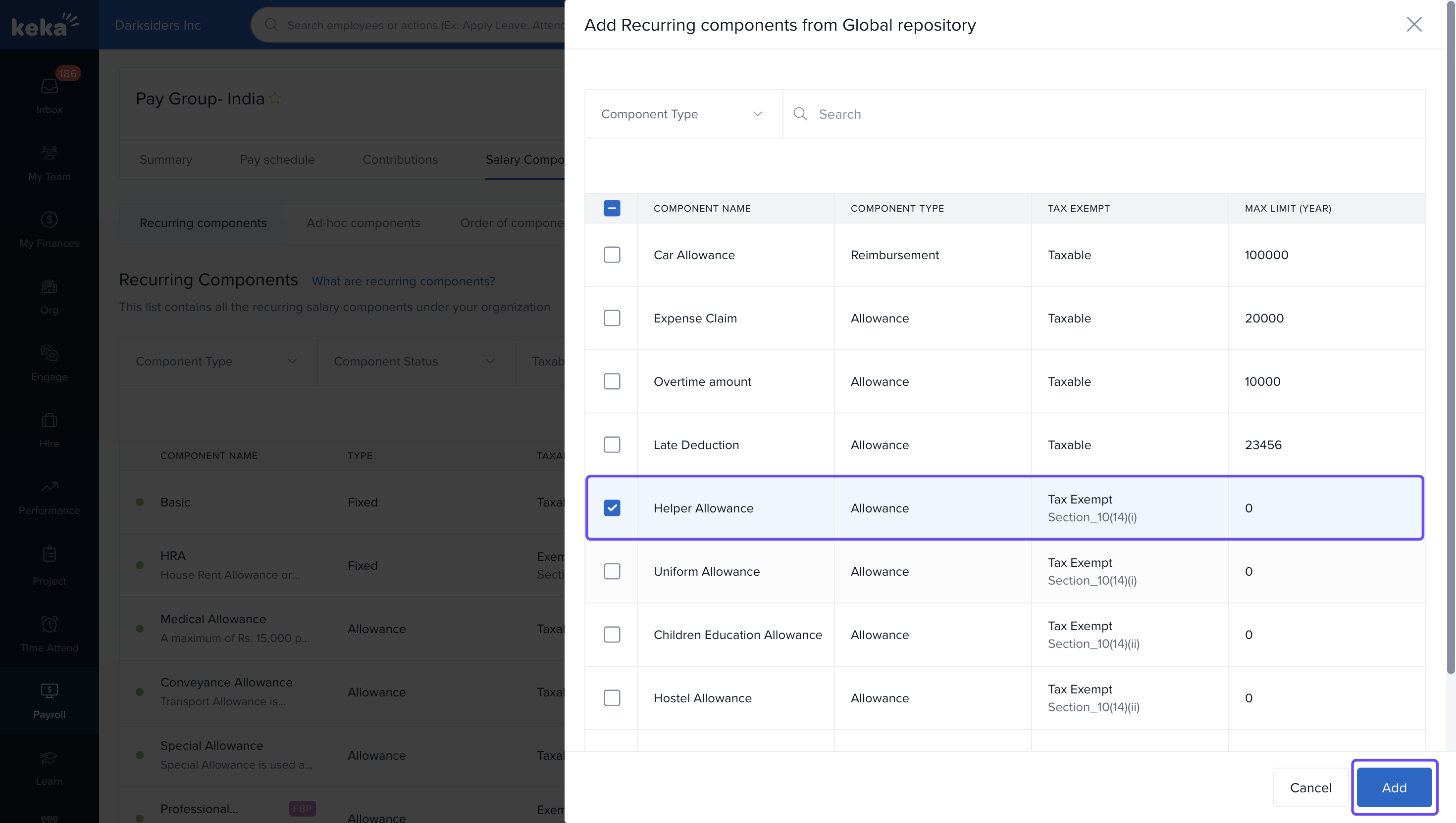 In the Add Salary Component window, select the newly added component and click Add Component.