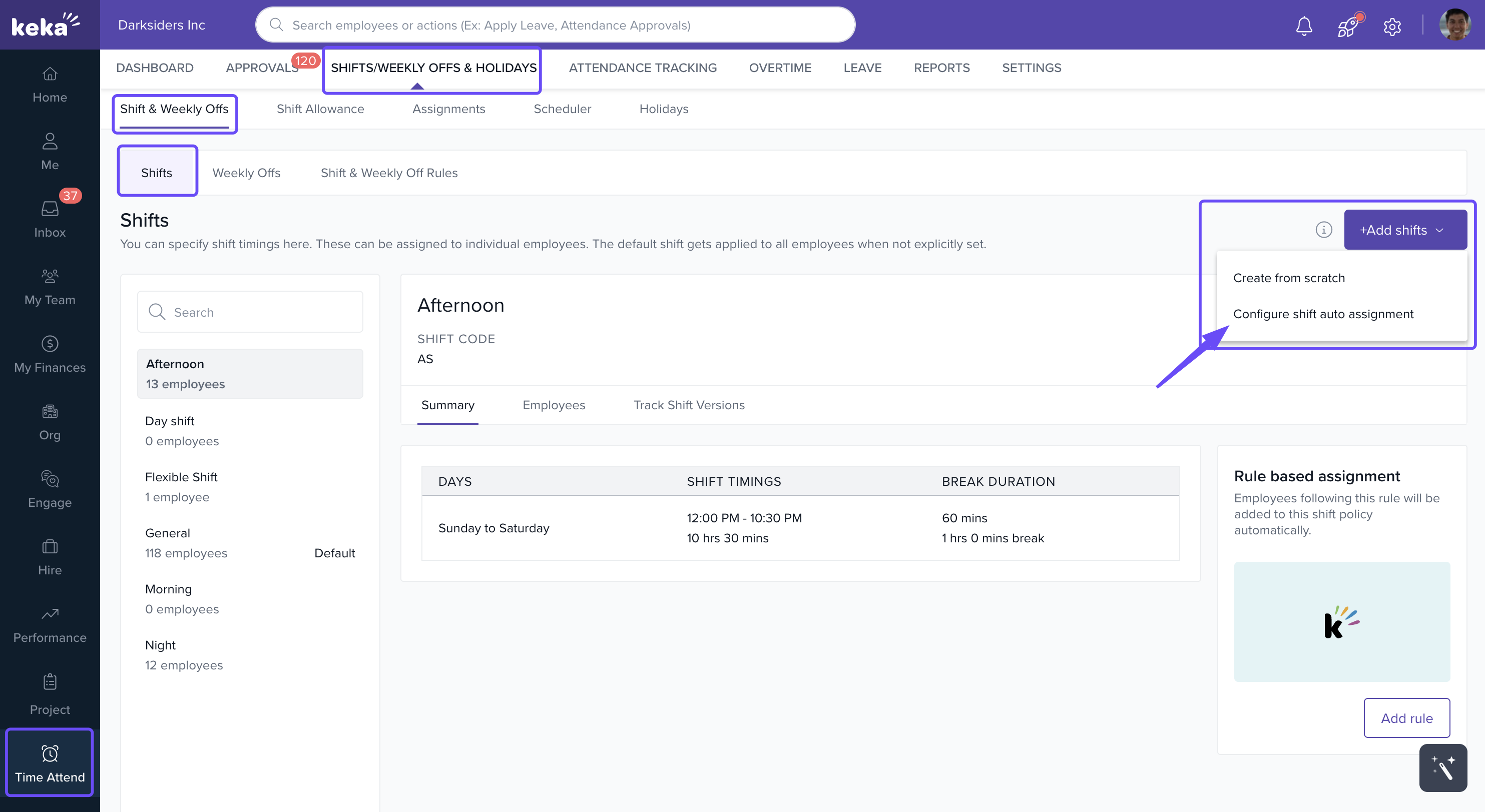 The auto-shift assignment feature in Keka HRMS lets you automatically assign employee shifts based on their first punch of the day.