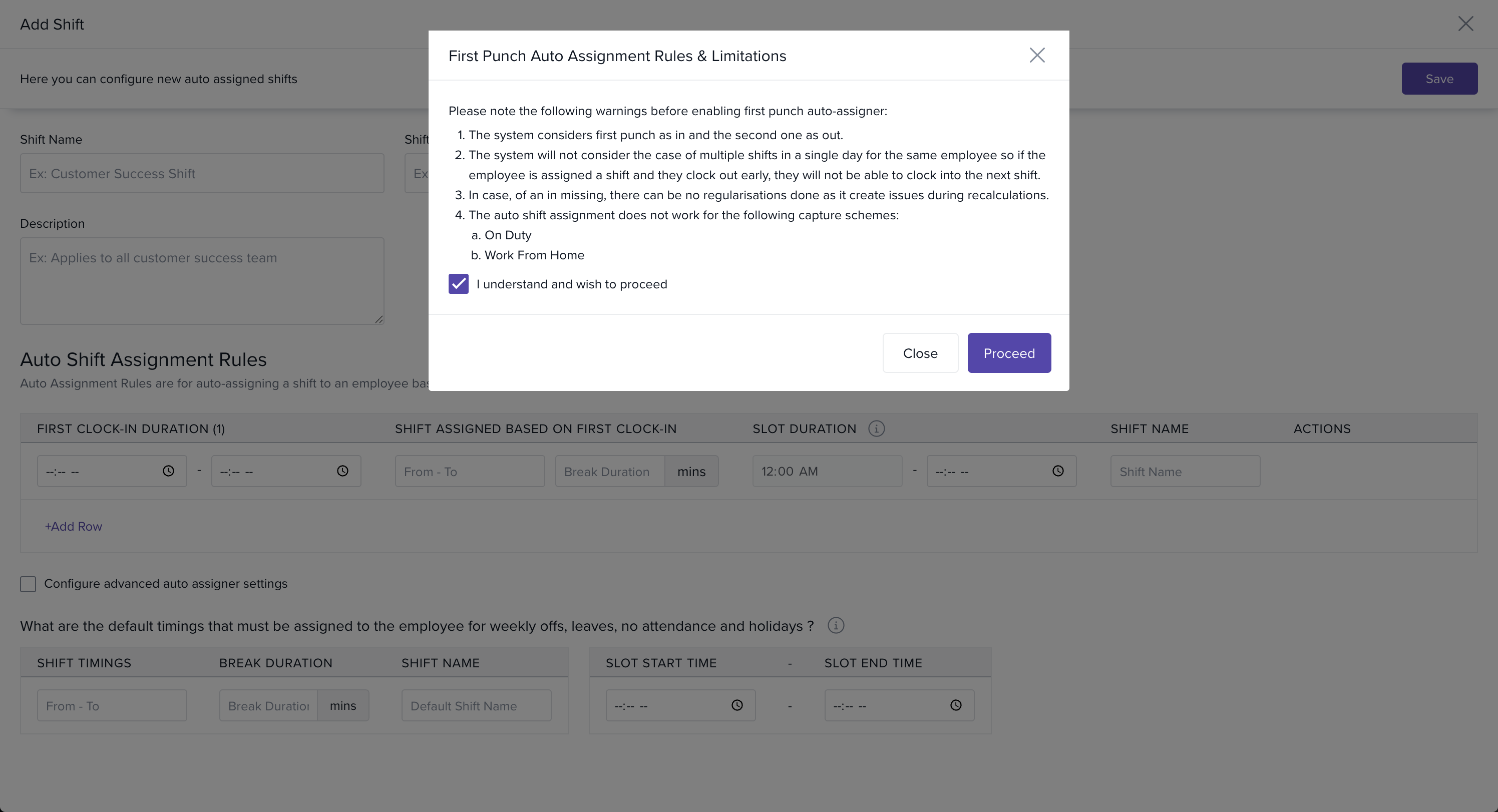 Auto-shift assignment does not work with On Duty or Work From Home schemes.