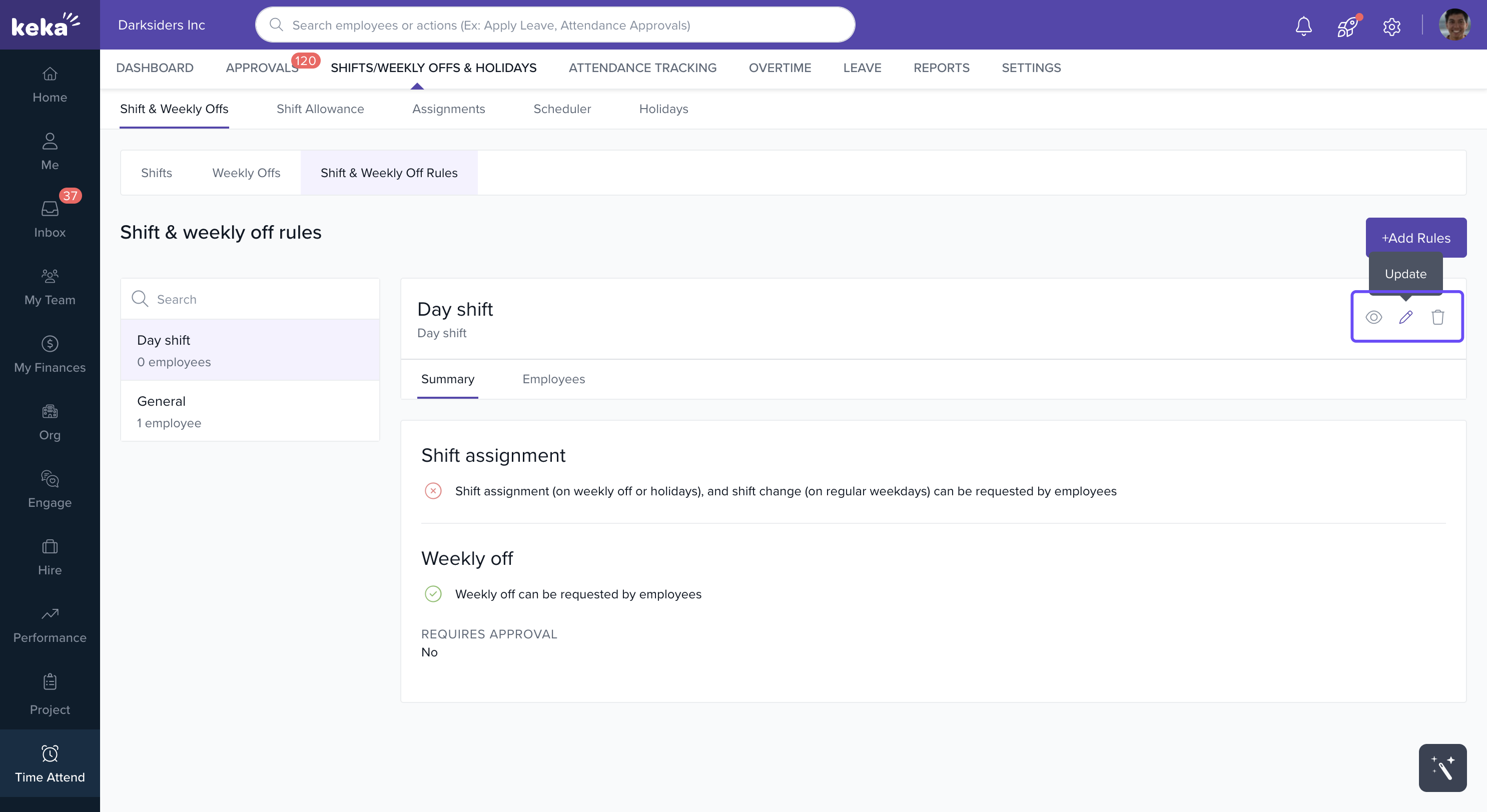 Important: A shift & weekly off rule cannot be deleted if it is linked to an active employee.