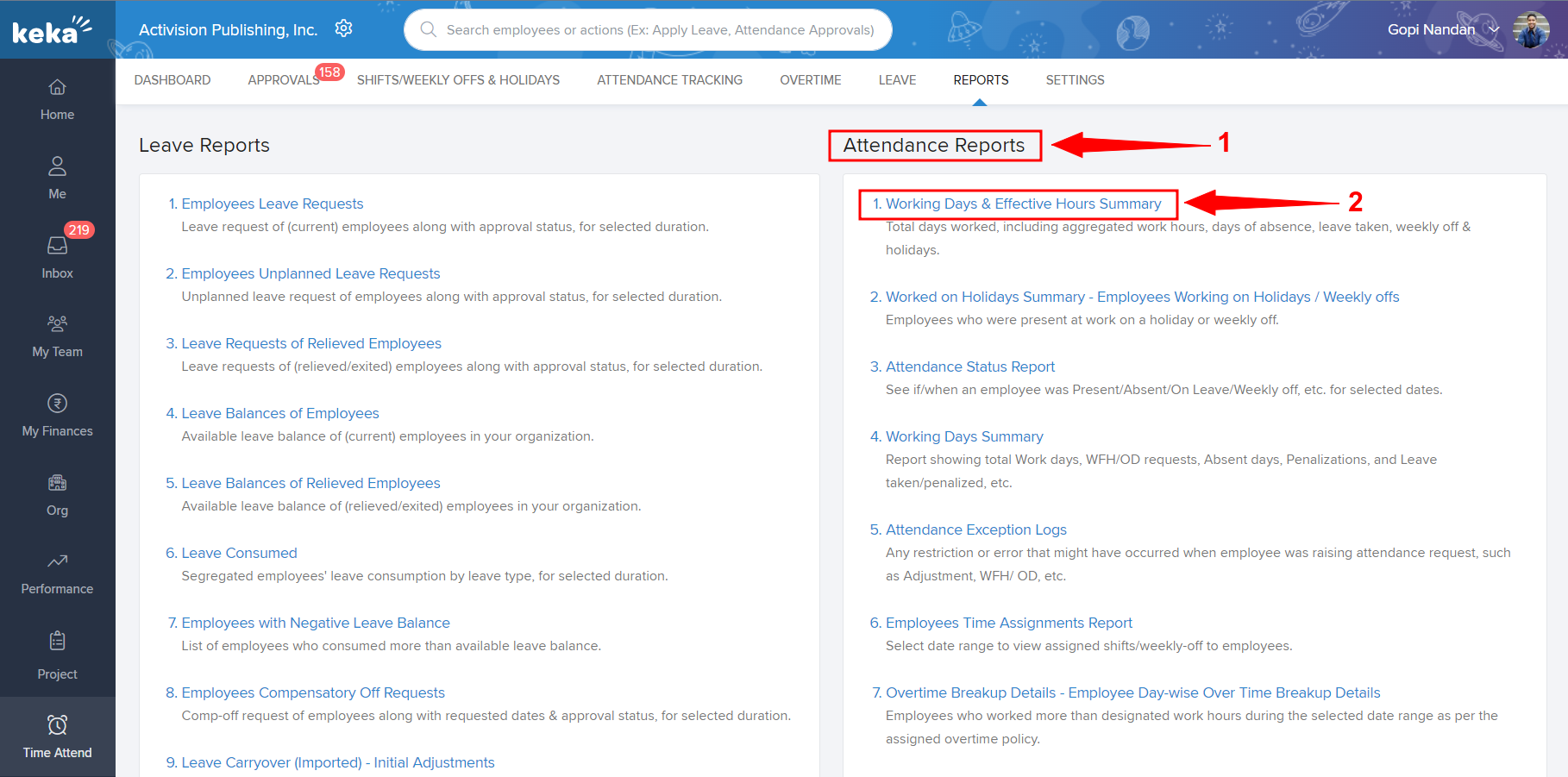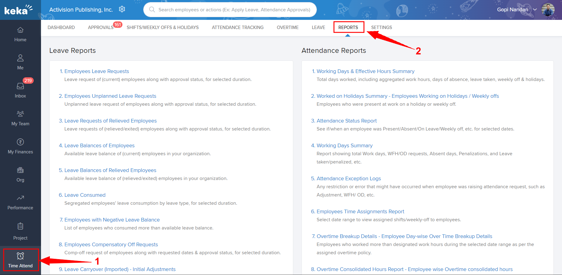 To find the attendance report on Keka, navigate to Time Attend (1) and go to Reports (2).